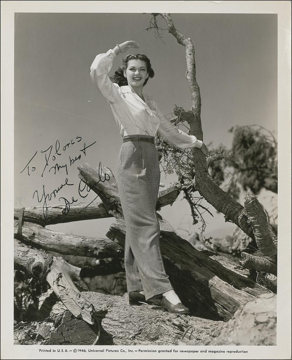 Vintage glossy 8 x 10 Universal Pictures publicity photo of the actress posing outdoors, signed and inscribed in fountain pen “To Dolores, My best, Yvonne DeCarlo.” The promotional caption is affixed to reverse. In very good condition, with scattered creases, surface marks, and crazing to finish.