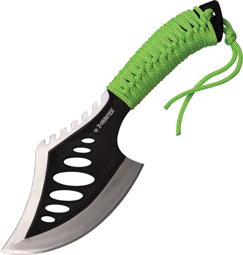 Axe - 10 1/2" overall. 5" axe head with sawback. Black rough painted stainless construction. Green paracord wrapped handle. Black nylon sheath.