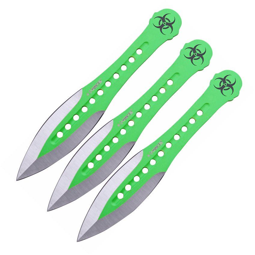 Knives are one piece 440 stainless two-tone green and satin finish. 7 1/2" overall. 3 3/8" double edge blade. Green finish handle with machined hole cutouts and black biohazard artwork. Black nylon belt sheath holds all.
