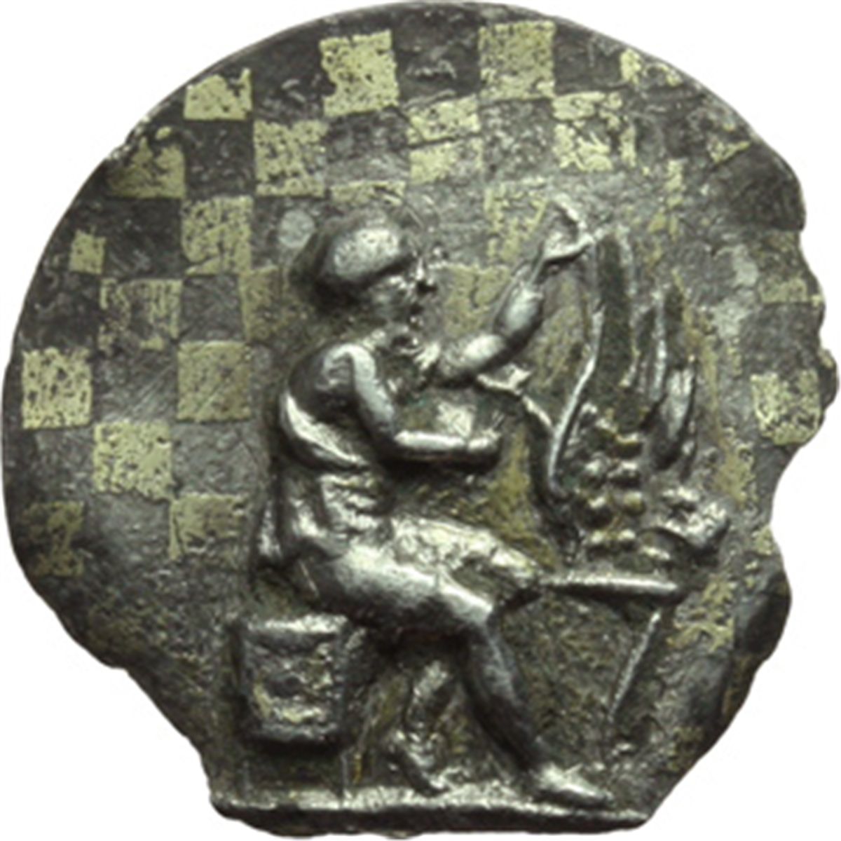 Mondo Greco. Grecia Continentale. Z-Miscellanea. Placchetta, IV-III secolo a.C. D/ Dedalo seduto a destra fabbrica un'ala. Fondo lavorato a scacchiera. R/ Liscio. AG. g. 0.93 mm. 17.00 RRR. Irregolaritv† marginale in ore 2-4. qSPL. Dedalo, il mitico artefice ateniese, aveva costruito il labirinto di Cnosso a Creta, dove Minosse lo rinchiuse con il figlio Icaro. Racconta Ovidio : ‚Äú Dedalo si trovava prigioniero, circondato dal mare. Egli pensv= allora: ‚ÄúMi vieti pure il tiranno le vie della terra e del mare! Tuttavia ho a disposizione il cielo. Me ne andrv= per di lv†!‚Äù‚Ķ..Dispose dunque delle penne l‚Äôuna dopo l‚Äôaltra, in scala ascendente, dalla pivp piccola alla pivp grande‚Ķ..Le legv= al centro con del filo mentre ne impastv= le estremitv† con la cera e impose al tutto una leggera curvatura per imitare le ali degli uccelli veri. Il figlioletto Icaro gli stava accanto‚ĶQuando l‚Äôopera fu terminata, l‚Äôartefice librv= il suo corpo su due ali e si alzv= battendo l‚Äôaria.‚Äù (Le Metamorfosi, VIII, 185‚Ķ202). Di estremo interesse iconografico e documentario. Rarissima ed apparentemente inedita.