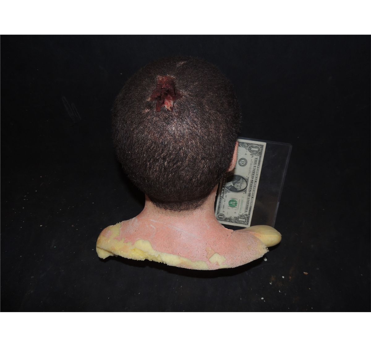 This is a seen from behind brains blown out rig from Z NATION. Suicide or Zombie kill.