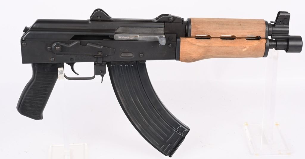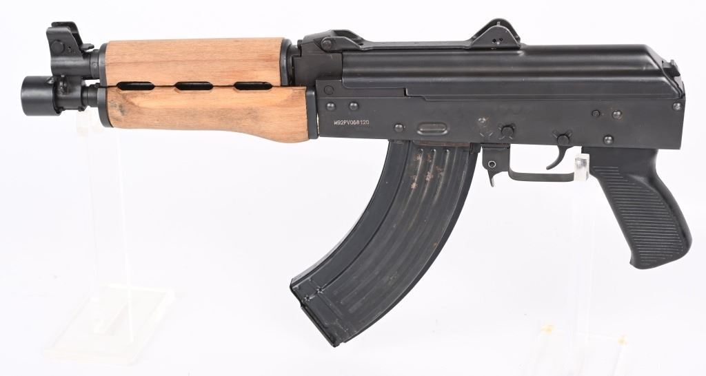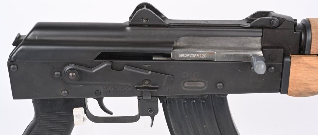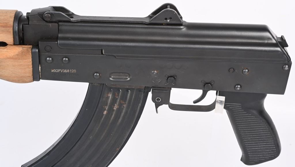 SERIAL NUMBER: M92PV068120. BARREL: 10". CALIBER: 7.62X39. MANUFACTURED: 2010'S. Made in Serbia and imported by CAI. Threaded muzzle, with thread protector welded on. Post front sight and two position flip rear. Flip up night sight as well. Matte blued finish. Polymer pistol grip and wood hand guard. Includes 30 round metal magazine. CONDITION: Metal is very good overall, with general wear and a few freckles of surface rust. Furniture is excellent. Bore is shiny with crisp rifling. Mechanically fine. MODERN