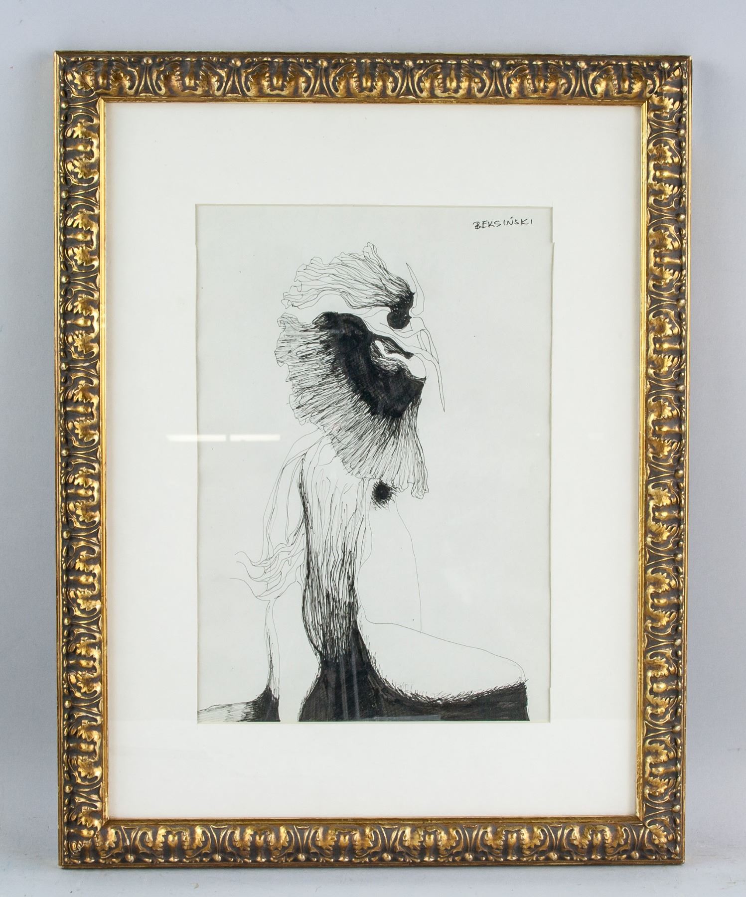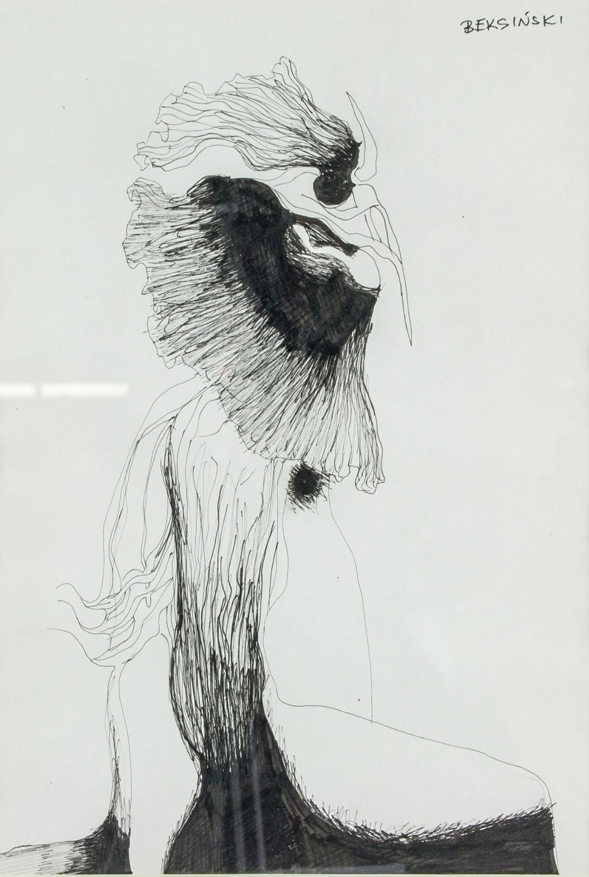 Ink on paper. Featuring surreal figural scene. 11.2 x 7.9 inch (28.5 x 20 cm). Zdzislaw Beksinski was a Polish painter, photographer and sculptor, specializing in the field of dystopian surrealism. Beksinski did his paintings and drawings in what he called either a 'Baroque' or a 'Gothic' manner. His creations were made mainly in two periods. The first period of work is generally considered to contain expressionistic color, with a strong style of "utopian realism" and surreal architecture, like a doomsday scenario. The second period contained more abstract style, with the main features of formalism. PROVENANCE: Southern Ontario Estate