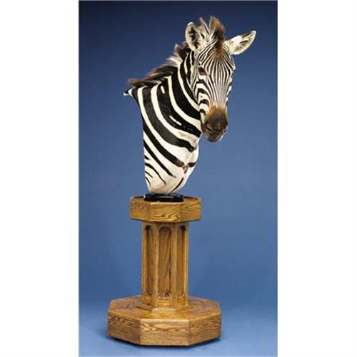 <B>ZEBRA SHOULDER PEDESTAL MOUNT</B></I><BR> <I>Equs hippotrigris burchelli</B></I><BR>This is a stunning mount of a beautiful South African Zebra. It is a large, mature stallion with a superb stripe pattern and full mane. The recently-done taxidermy is of competition quality and the attractive oak pedestal mount is on rollers, measuring 69½ inches high and 25½ inches wide overall. <BR><BR><b>Shipping:</b> Requires 3rd Party Shipping (<a target="_blank" href="http://www.heritageauctions.com/common/shipping.php">view shipping information</a>)