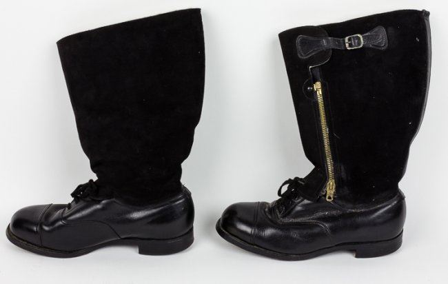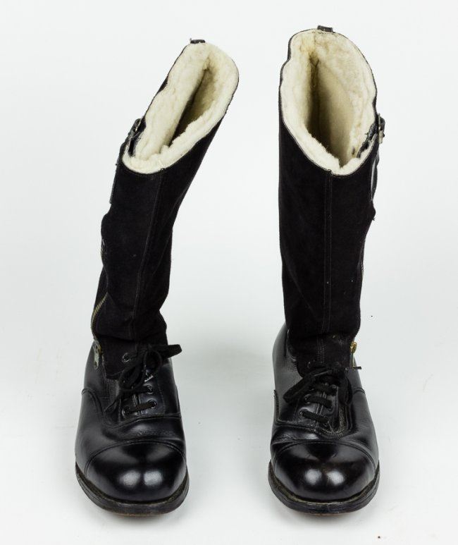 Pair of black leather and suede flying boots, owned by a member of "Zemke's Wolf Pack", the 56th Fighter Group. These boots were designed so that the suede upper legging could be cut away with a small knife concealed in a pocket in the right boot (not present), leaving a pair of black lace-up leather shoes that were much less conspicuous in enemy territory. The zippers bear a slight amount of green tarnish, but the boots are otherwise in very good condition. From the extensive collection of 62nd Fighter Squadron, 56th Fighter Group ace FRED J. CHRISTENSON (1921-2006). Christenson collected these items during his service with "Zemke's Wolf Pack", the nickname given the famous 56th Fighter Group. Hubert A. "Hub" Zemke commanded the group, composed of P-47s which closely escorted American bombers. While under Zemke's command (he would be later captured), the 56th FG claimed over 500 of the eventual 665.5 German aircraft the group destroyed. Christenson himself shot down 21.5 aircraft, once downing six planes in less than two minutes. With a copy of a reunion flyer, patch, and paperwork from the 2006 sale of Christenson's collection.
