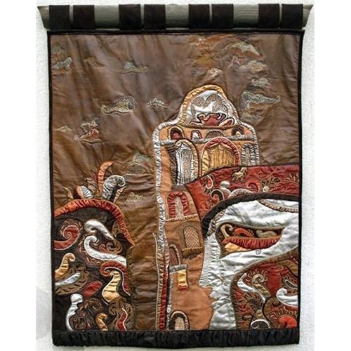 ** ZEN SERENITY ** SILK EMBROIDERED LEATHER TAPESTRY, ARTIST SIGNED.
