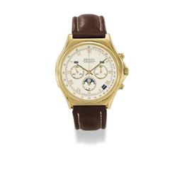 18K, NICKEL LEVER MOVEMENT, SILVERED DIAL, THREE SUBSIDIARY DIALS FOR CONSTANT SECONDS AND COUNTERS FOR 30 MINUTES AND 12 HOURS COMBINED WITH MOON PHASES, APERTURES FOR DAY, DATE AND MONTH, OUTER RING CALIBRATED FOR TACHOMETER, CIRCULAR CASE SIGNED ON MOVEMENT, CASE AND DIAL, NUMBERED ON CASE DIAMETER 40 MM