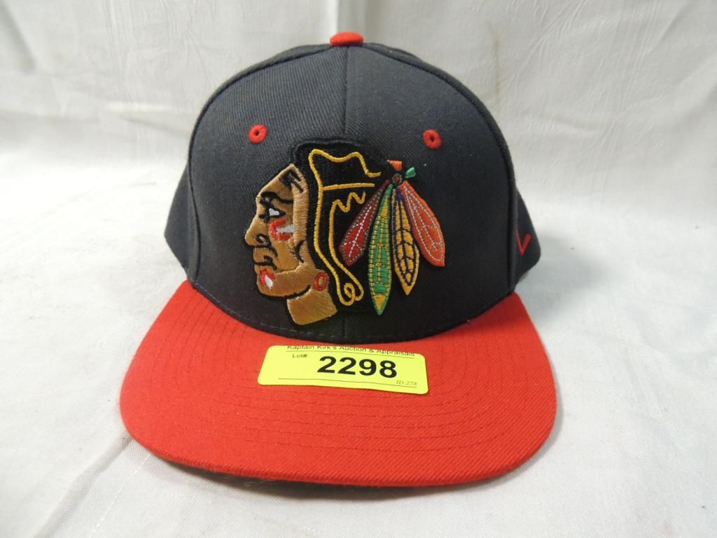 CHICAGO BLACKHAWKS. FLAT BRIM HAT. GREAT CONDITION STILL HAS HAT BOARD. AS SHOWN. SEE PHOTO FOR MORE DETAILS