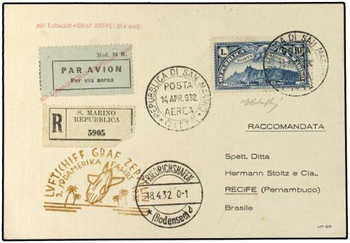 1932 ALEMANIA. 3rd S.America Flight. Registered San Marino acceptance card to Recife franking L10 air tied by cds. Obverse bears gold flight cachet + red straight-line "Mit Luftschiff ´Graf Zeppelin´ flach". Arrival backstamp.