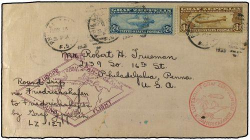 1930 ALEMANIA. "Europa-Pan America Round Flight" – United States acceptance cover, with original letter, to Philadelphia, PA, USA, franked $1.30 & $2.60 Zeppelins tied by cds. Obverse also bears red ´Sugar Loaf Mountain´ & violet diamond ´Route map´ flight cachets. On reverse, green illustrated Lakehurst, NJ, transit cds.