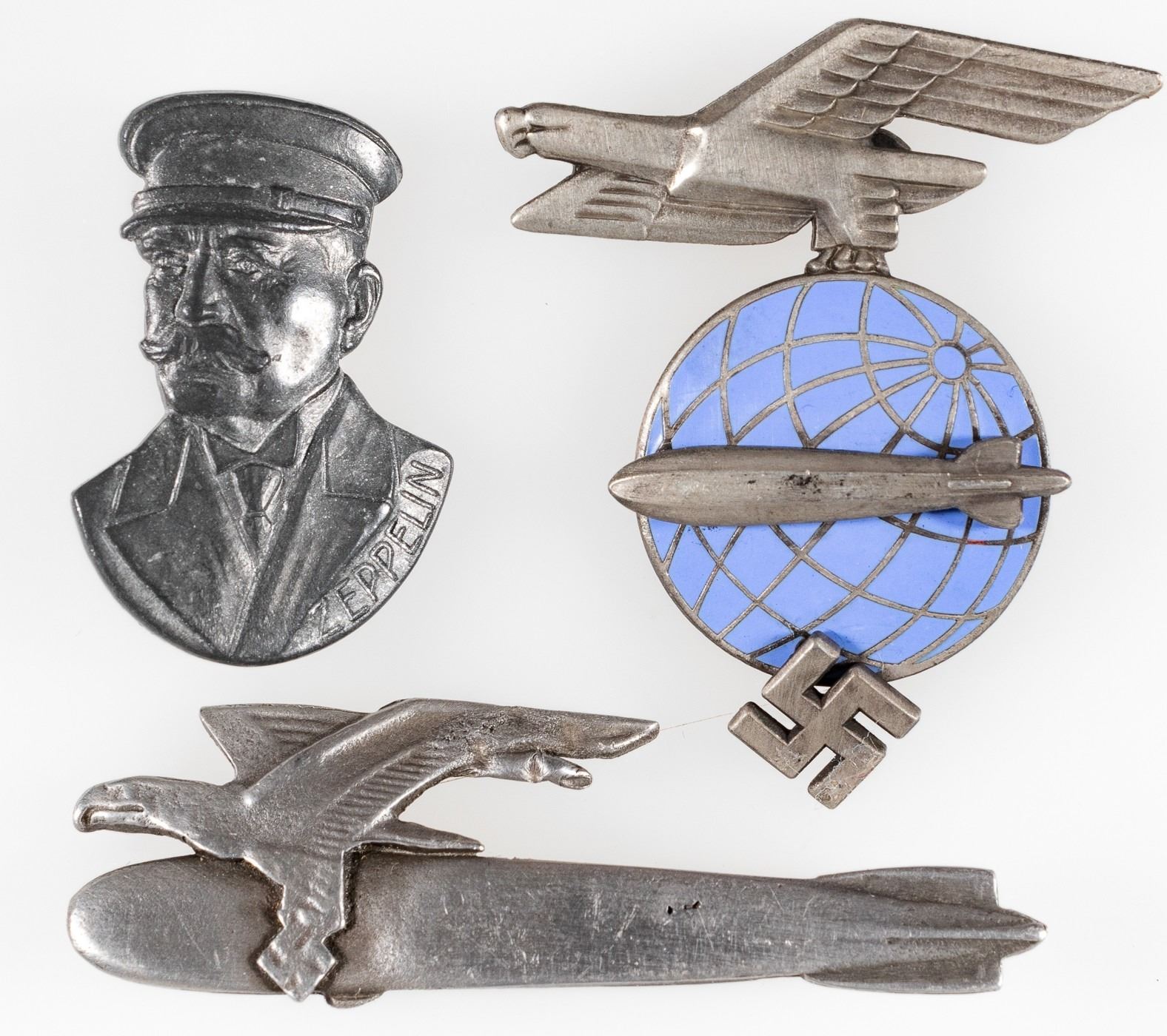 Lot of three pins, a Zeppelin cap badge, a Zeppelin badge, and a badge of Ferdinand von Zeppelin.