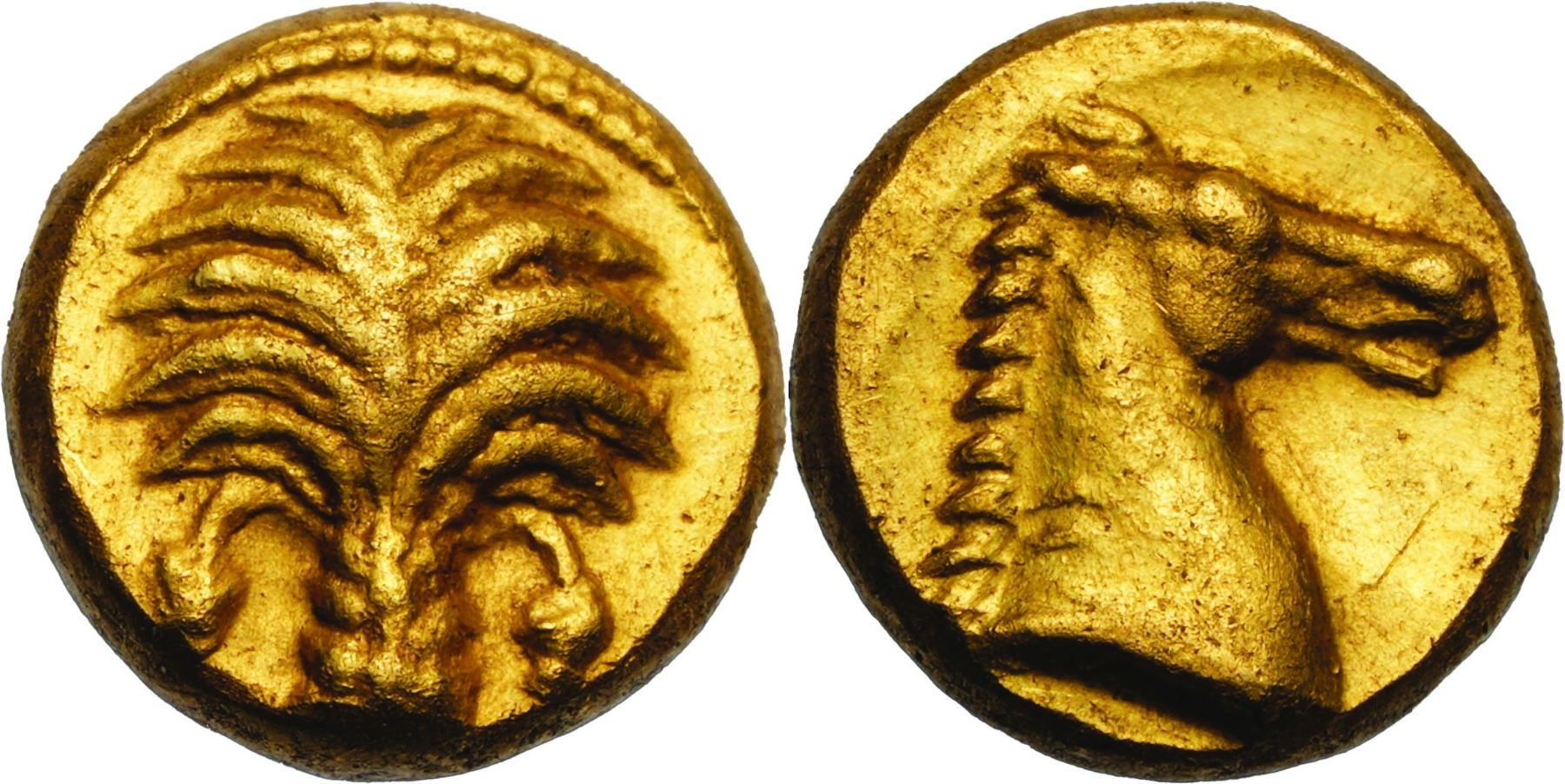 ZEUGITANIE 1/10 de statère d'or, Carthage, 340-320 avant J.C., AU 0.94 g. Avers : Palmier Revers