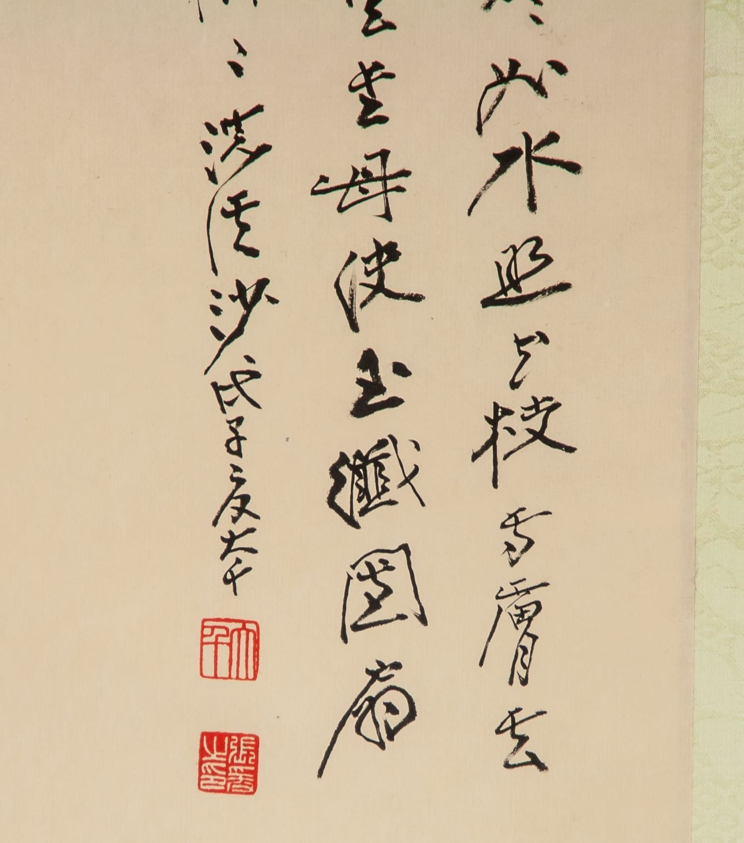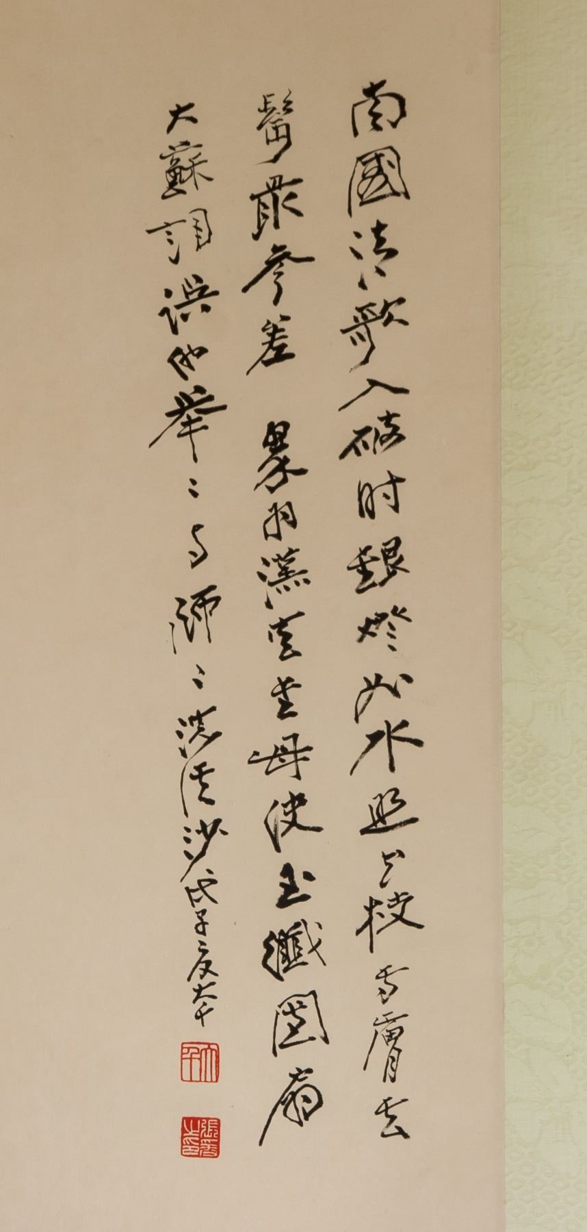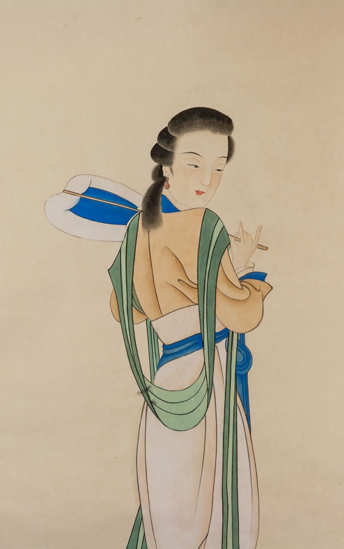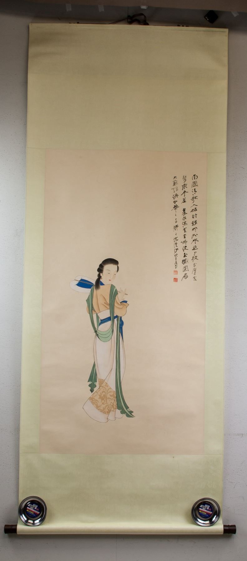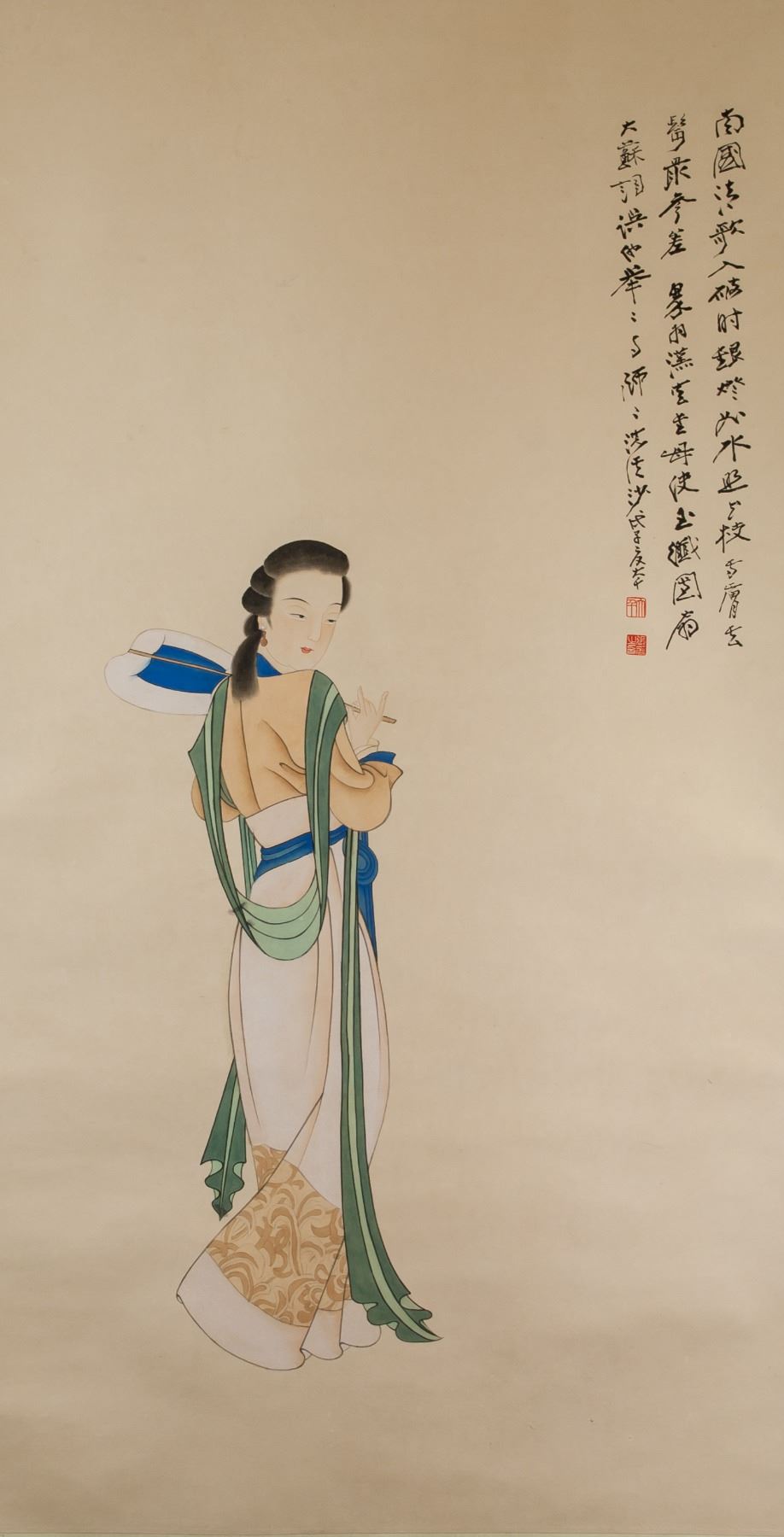 Ink and watercolor on paper, hanging scroll, featuring standing beauty, signed Zhang Daqian (Chinese, 1899-1983), inscribed with 2 artist seals, 102.5 x 60.5 cm