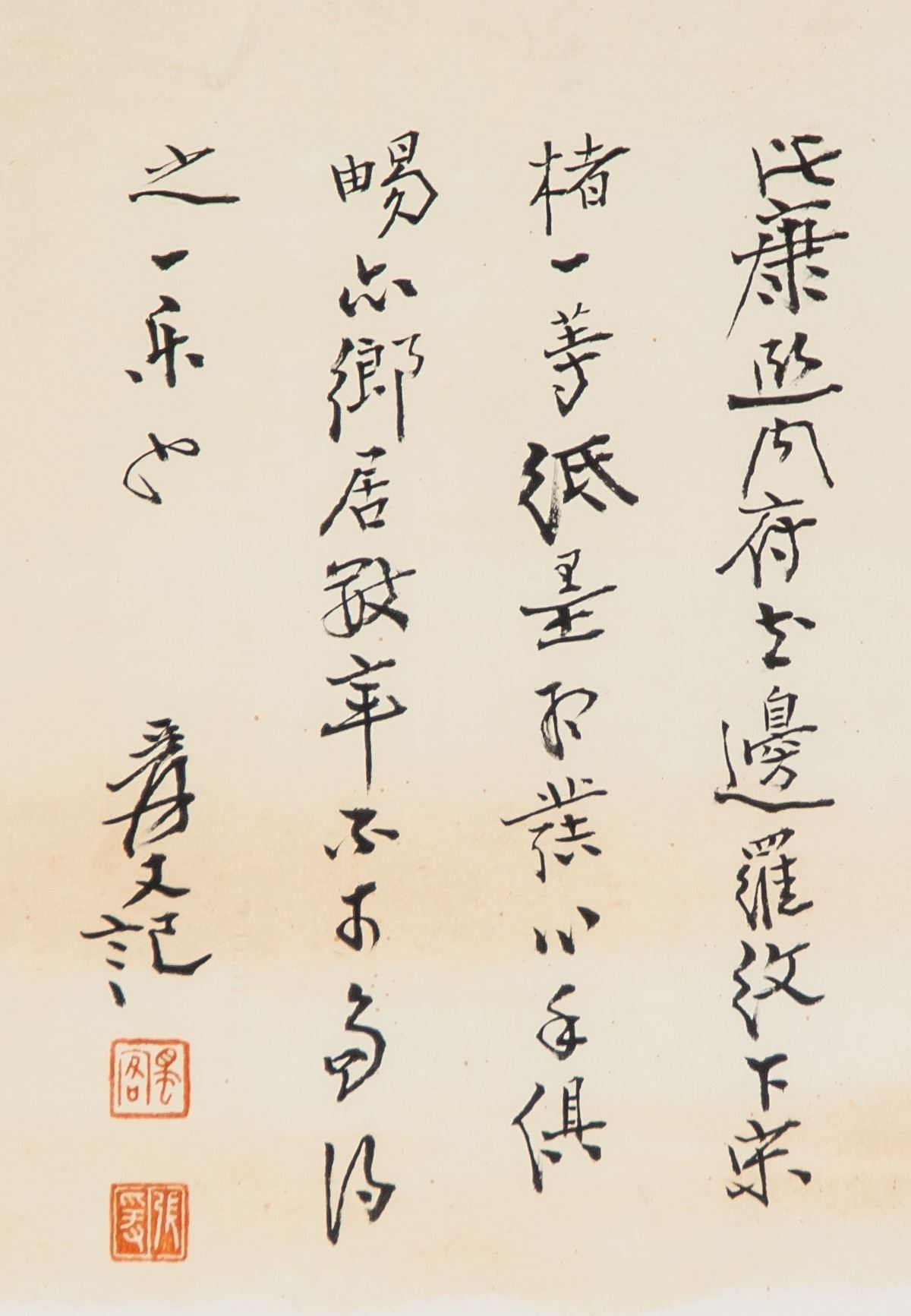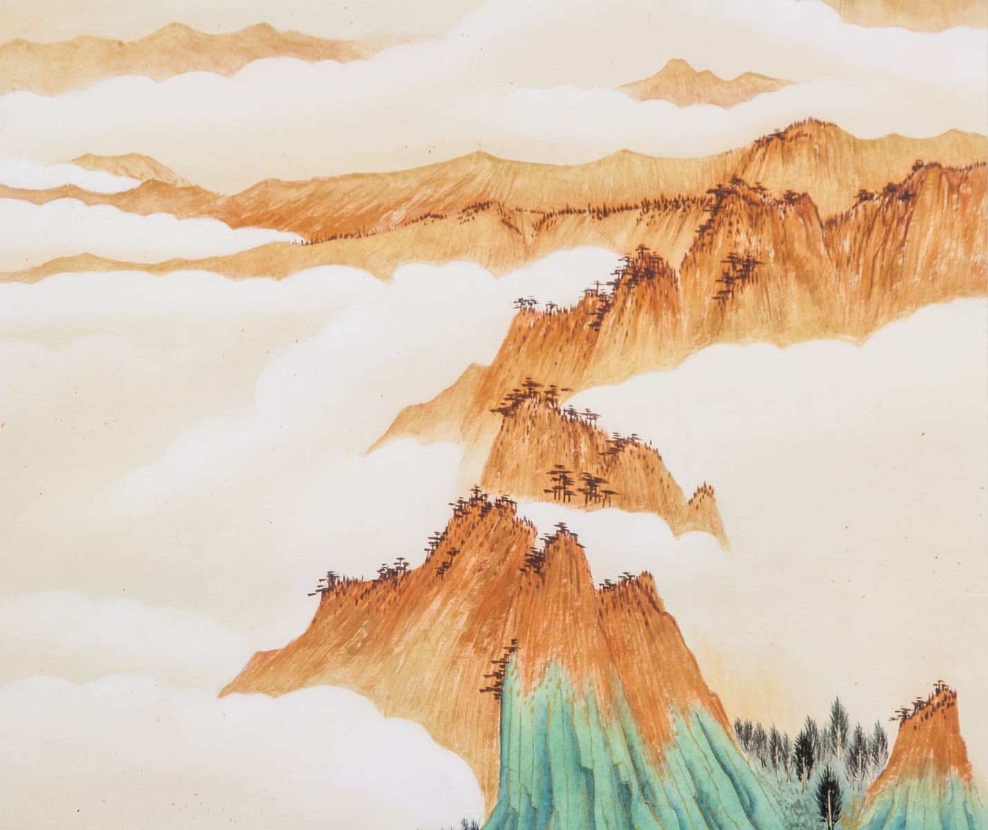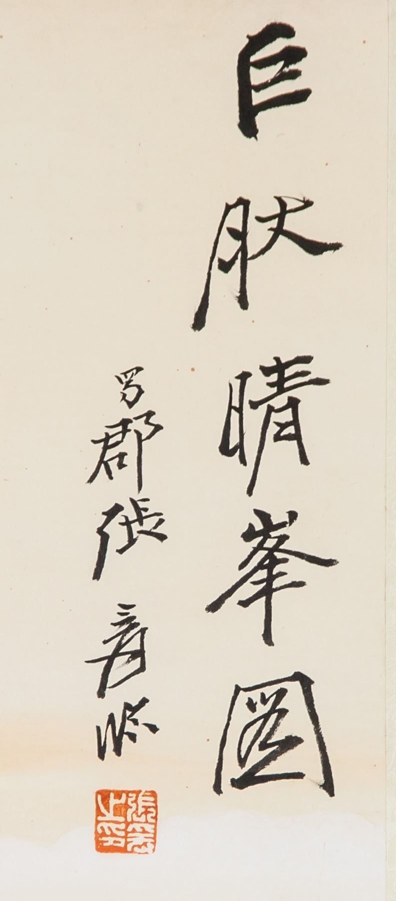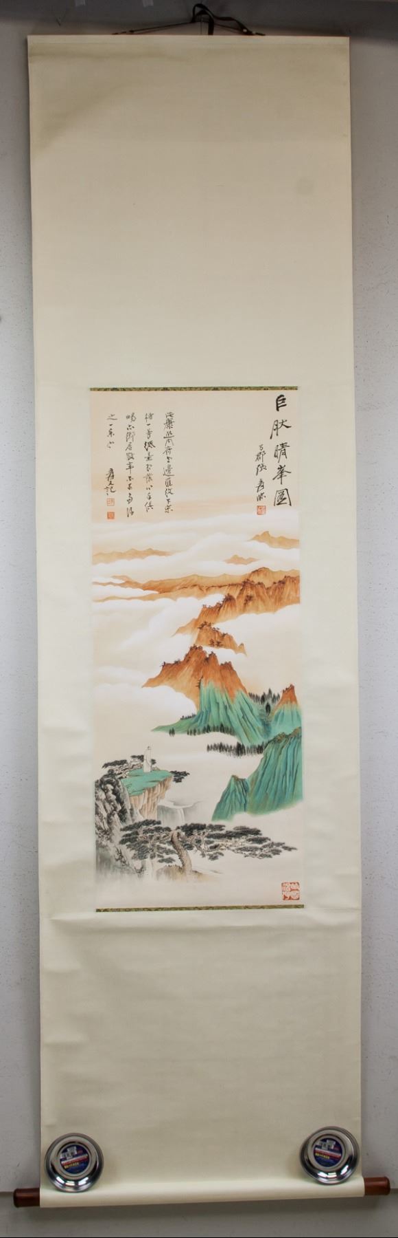 Watercolor and ink on paper, hanging scroll, featuring mountainous landscape, signed and attributed to Zhang Daqian (Chinese, 1899-1983), inscribed with 4 artist seals, 138 x 70 cm, Zhang Daqian was a Chinese artist known for painting in traditional Eastern techniques while exploring the Western movements of Impressionism and Expressionism. His use of delicate brushstrokes and splashed color application, produced unique images of nature. Today, Zhang’s home, known as the Zhang Daqian Residence, is a memorial to the artist maintained by the National Palace Museum in Taipei, his works are held in the collections of the Metropolitan Museum of Art in New York, the Art Institute of Chicago, the Denver Art Museum, and the Los Angeles County Museum of Art, among others.