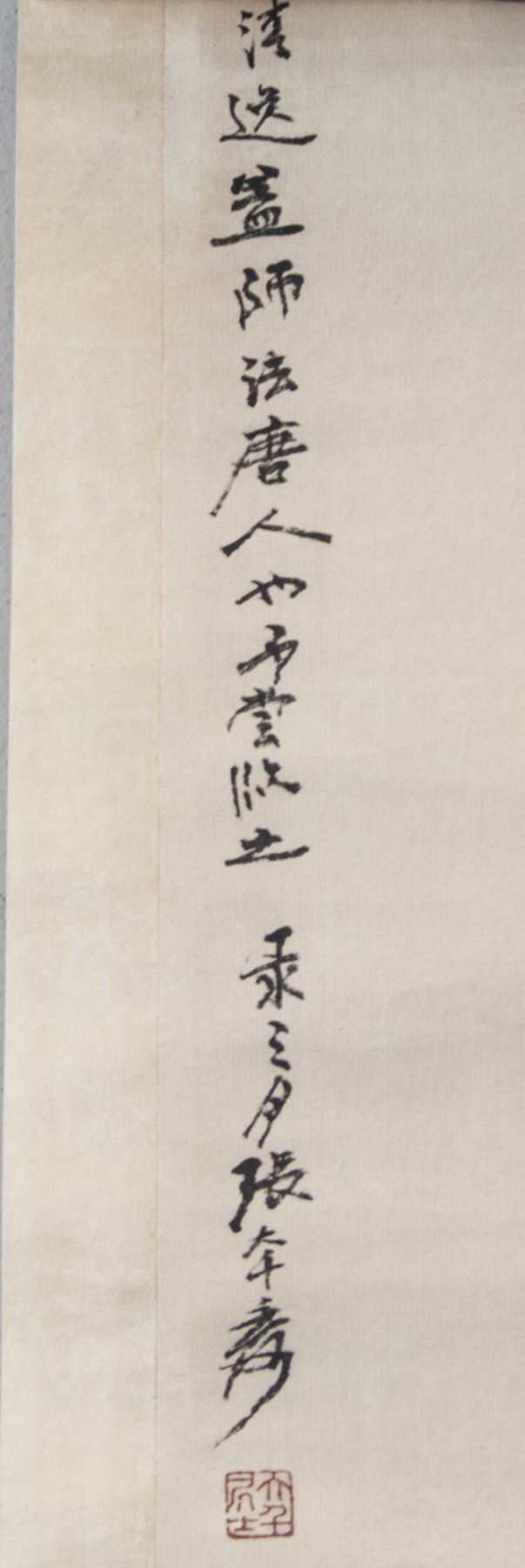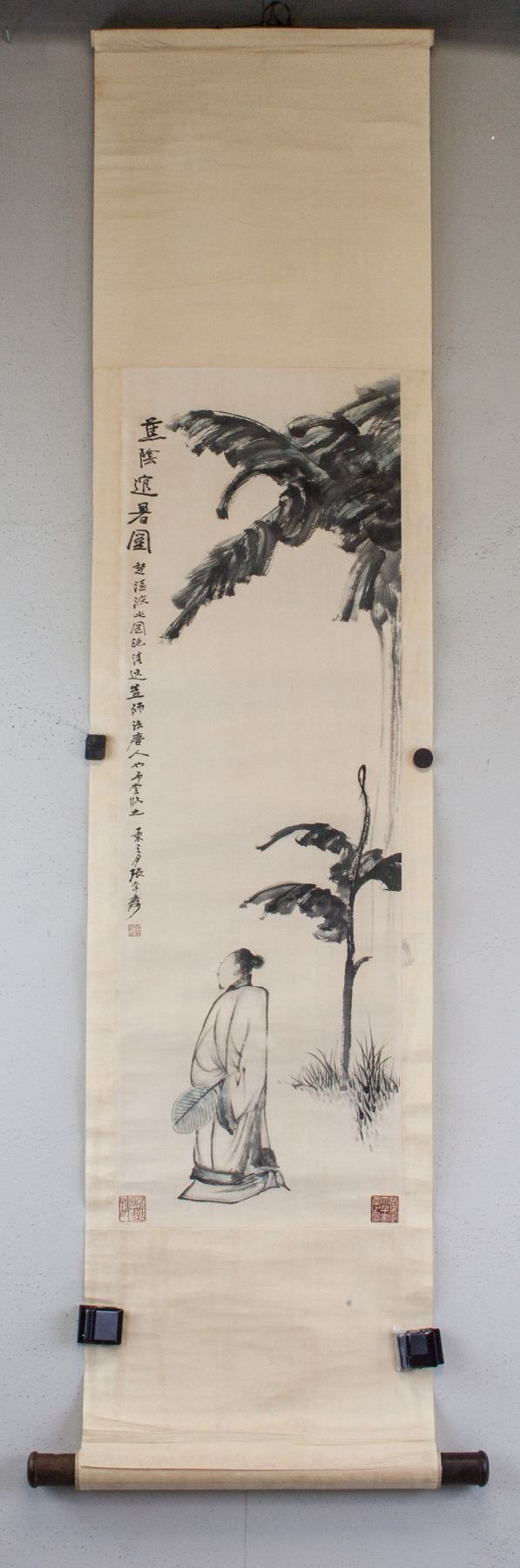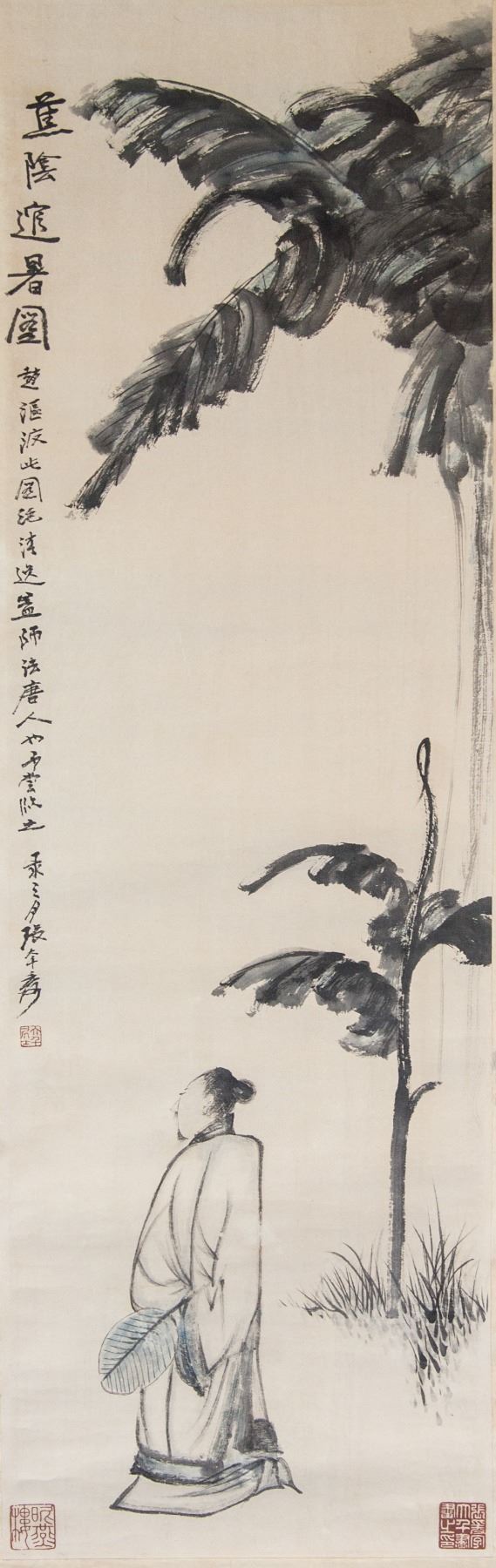 Painting of hermit under basjoo tree; Chinese ink and watercolour on paper; hanging scroll; signed Zhang Daqian (1899-1983); inscribed with 3 artist seals; 86 x 27 cm