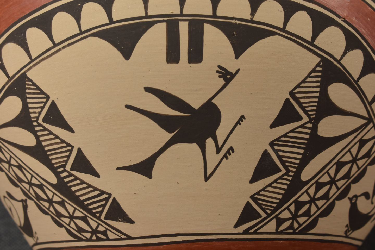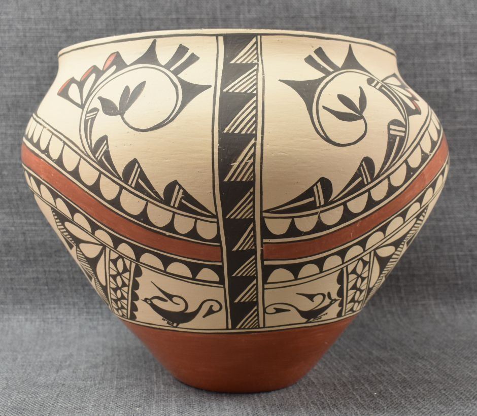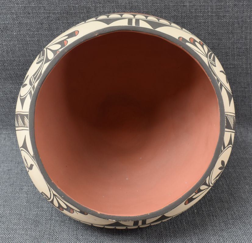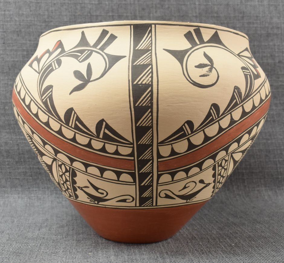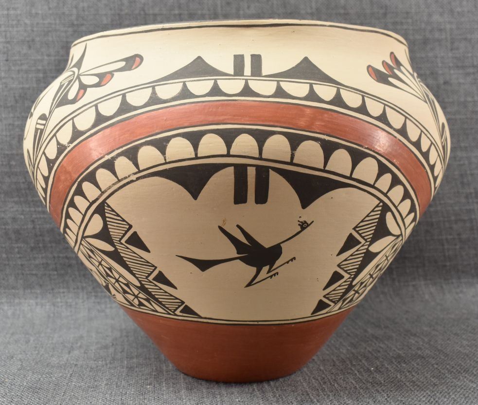 1980's Zia, hand coiled with polychrome painted bird and geometric design by Irene Herrera 8.75" x 11"