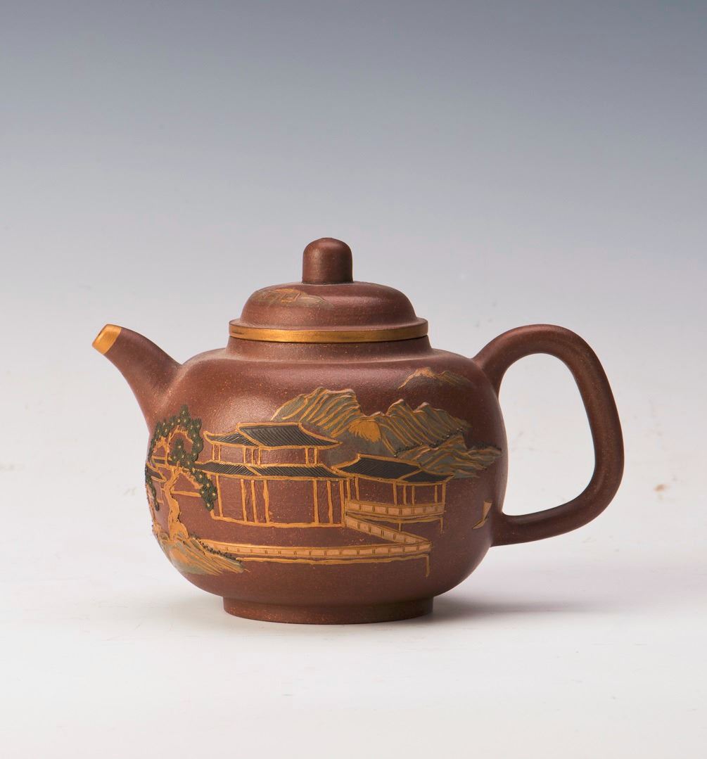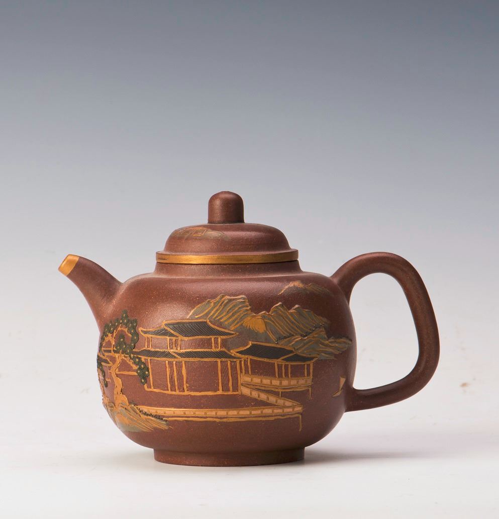 Chinese exquisite zisha teapot of round form with Chinese landscape Chinese Painting on the surface and cap with gold color, six-character seal inscribed on the base. Length 6.25" Height 4.25"
