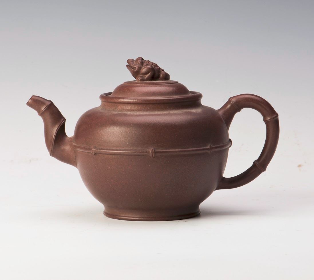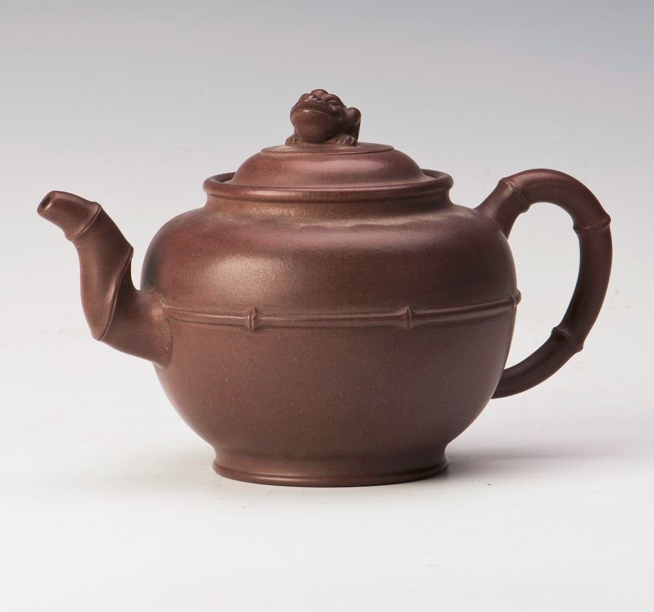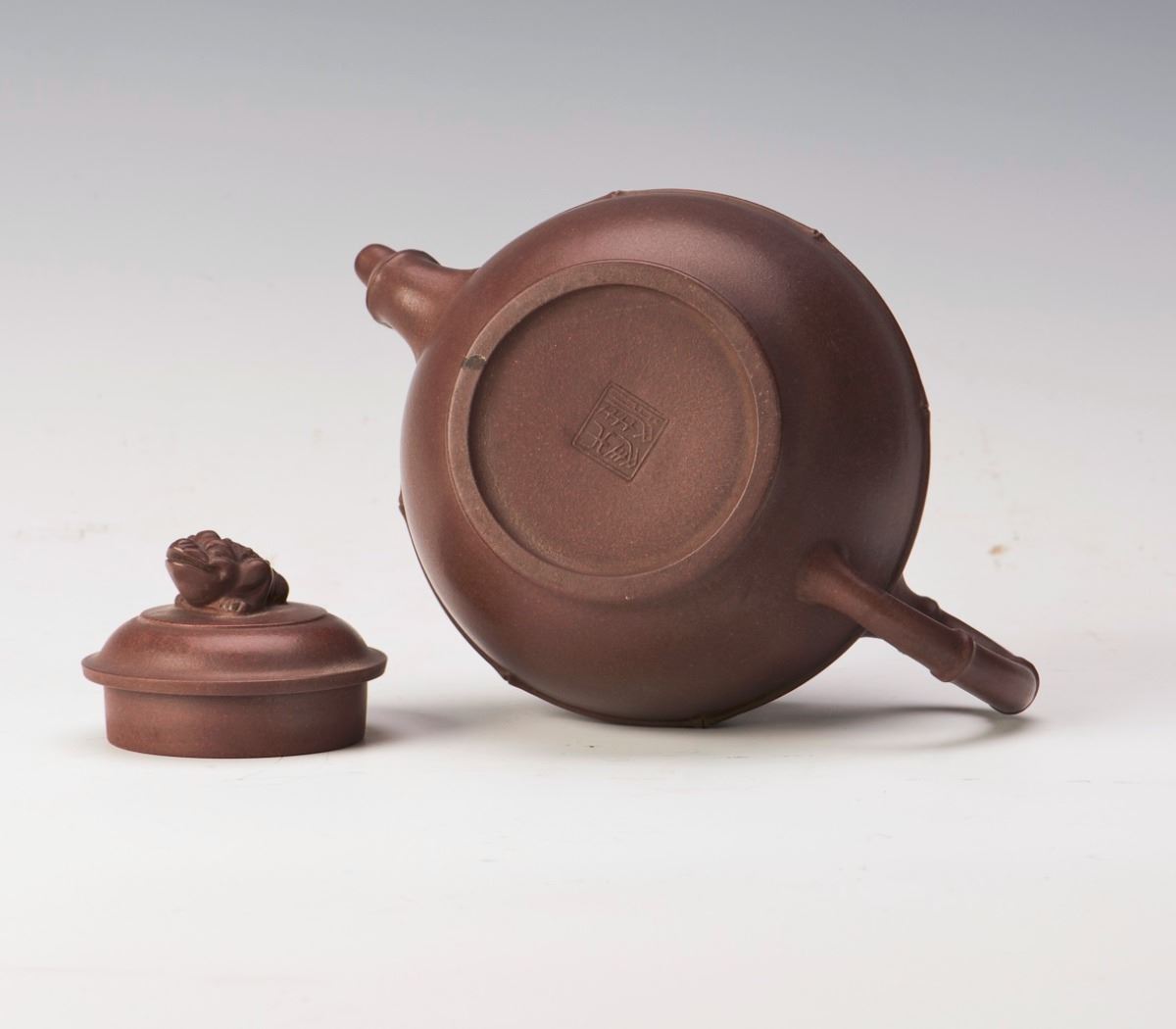 Finely crafted Zisha Teapot, with a vivid desigh of the gold toad form cap and bamboo-style handle. Length 7.5" Height 4.5"