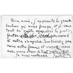 (1840 - 1902) French novelist and founder of Naturalism in literature, author of Germinal and fervent supporter of Alfred Dreyfus. A.L.S. "Emile Zola" on the face of his personal printed calling card, 1p. 16mo., [n.p., n.d.], in French to a friend, in part: "...I learned of the great sorrow that strikes you and wanted to let you know immediately how much we fraternally support your grieving...Kiss your wife for us and believe that our hearts are with both of you...". A vertical crease at right margin, lightly affecting text, otherwise very good.
