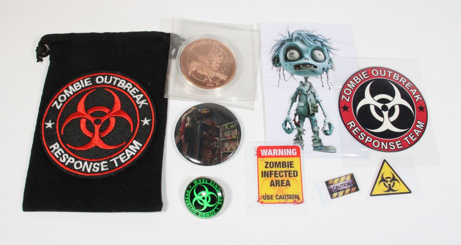 LIMITED MINTAGE. COMES IN CAPSULE AND FLIP AS TO HOLD THE SILVER ONE. COMES WITH ZOMBIE OUTBREAK RESPONSE TEAM BAG. AND MISC. ZOMBIE RELATED ITEMS