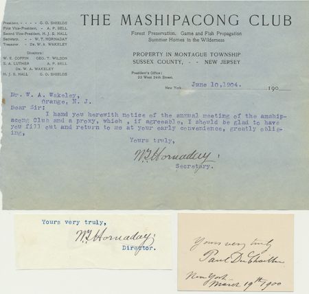 Three piece by prominent nineteenth century zoologists: PAUL DU CHAILLU (signatures on a small card), and WILLIAM TEMPLE HORNADAY (signature on a small card and T.L.S. regarding a meeting). Very good.