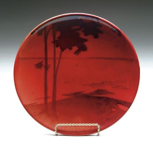 ZSOLNAY DECORATED PLATE. Wonderful early Zsolnay plate has slip decorated design of trees against red water and sky background. Marked on the back with white five churchs mark under the glaze. Mark used from 1893-1930. Back of plate is impressed "Hungary", some letters and numbers that are discernable, "470" as well as "11". SIZE: 9 in. dia. CONDITION: Couple of minor scratches to the front of the plate and a small chip on underside at a hole for hanging. 5-60290