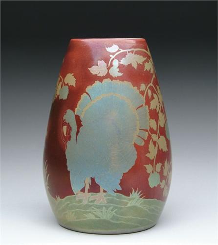 ZSOLNAY DECORATED VASE. Interesting Zsolnay vase is decorated with male and female turkeys and flowering tree against a copper iridescent background. Signed on the underside "Zsolnay Pecs" within shield with 5 Churches, "Made in Hungary". Also impressed on bottom "Zsolnay Pecs 5330" and artist initials "K M". SIZE: 7-1/2 in. t. CONDITION: Minor scratches to glaze, otherwise very good. 5-61481