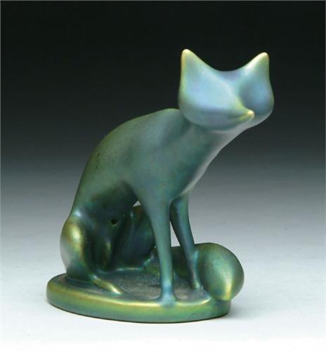 ZSOLNAY FOX. Stylized figure of a fox is finished in green Eosin glaze and marked on the bottom with five churches in shielded circle along with "Made in Hungary". SIZE: 5-1/2 in. l x 4-1/2 in. t. CONDITION: Very good to excellent. 5-60313
