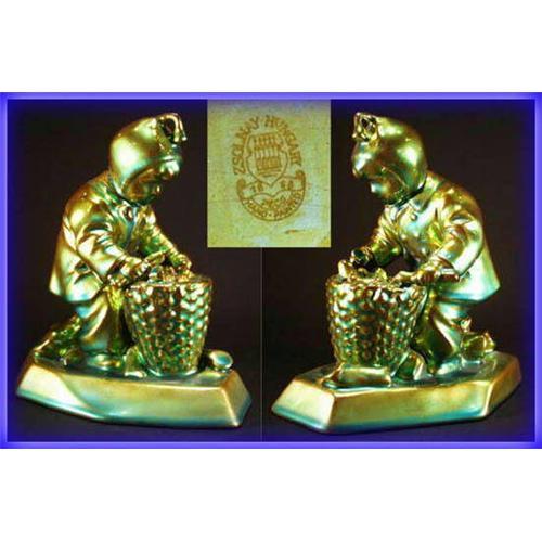 If you are REALLY interested in this item, please note that for Ebay Live Auction only bids at or above $130 will be successful and meet our reserve. Adorable Zsolnay boy figurine picking up the firewood. This piece was designed by Andras Simko around 1920. The base is signed with Zsolnay mark. Excellent condition, no chips, cracks or repairs. Dimension : 5" high, Zsolnay, Hungary circa 1960-70's. In some cases photos in Ebay Live Auctions are reduced, so if you want to see larger, more detailed photo, please email us (
