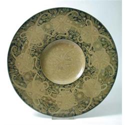 Keramik. Heller Scherben mit Craqueléeglasur und Metallüster-Bemalung in mehrtonigem Olivgrün und Beige. Krakendekor auf grasartig gefiedertem Grund. Rest. Haarriss an der Fahne. Ø 30 cm. Bez.: Firmenmarke (Aufglasurstempel), Etikettenrest. Um 1895 Lit.: Zsolnay, Ungarische Jugendstilkeramik, Museum für Kunstgewerbe Budapest, Wien 1986, Abb. S. 125, Nr. 139-140 (dort Dekorvariante)