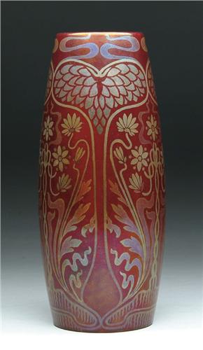 ZSOLNAY SECESSIONIST VASE. Wonderful Zsolnay vase has beautiful Secession decoration covering the entire vase. The silver and blue decoration stands out against a copper Eosin background. Marked on the bottom with the five churches inside a dotted circle. Impressed with form number "5282", also impressed with "36" and "1". SIZE: 11-1/2 in. t. CONDITION: Two tiny fleabite to glaze on rim, otherwise very good to excellent. 5-60307