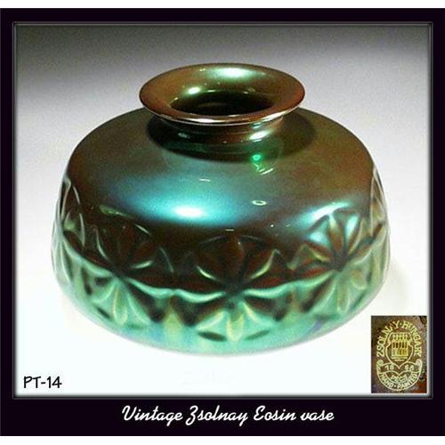 Beautiful Art Deco style green iridescent "Eosin" vase. MINT condition, no chips, cracks or repairs. Signed on the bottom : Zsolnay, Hungary - Pecs 1868 - enclosed in "five steeple" Zsolnay mark. Size : 5" diameter. Please note : This is NOT new piece. Please note that in some cases photo sizes are automatically reduced, so if you want to see full size or detailed pictures, please email us () Please note that for Ebay Live Auctions only bids at or over $110.00 will be successful and meet our reserve.
