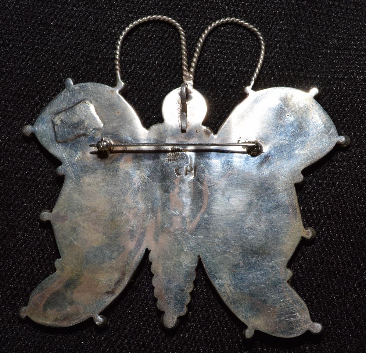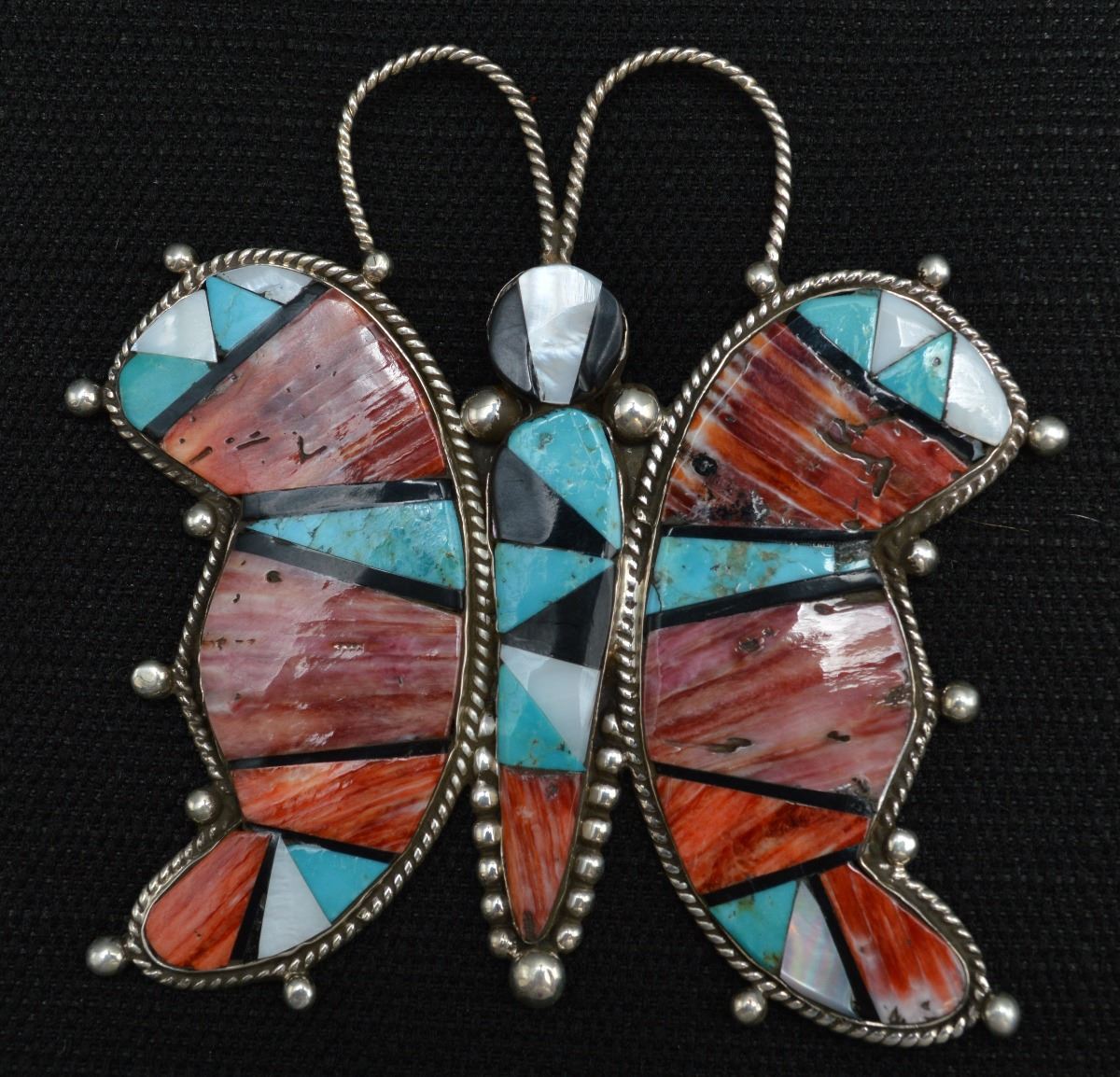 1970's. Sterling silver hand made butterfly with mosaic inlaid jet, turquoise, coral and shell, with twisted wire and silver drop design. Stamped initials on back. 3.75" x 3.75", 2.7 oz.