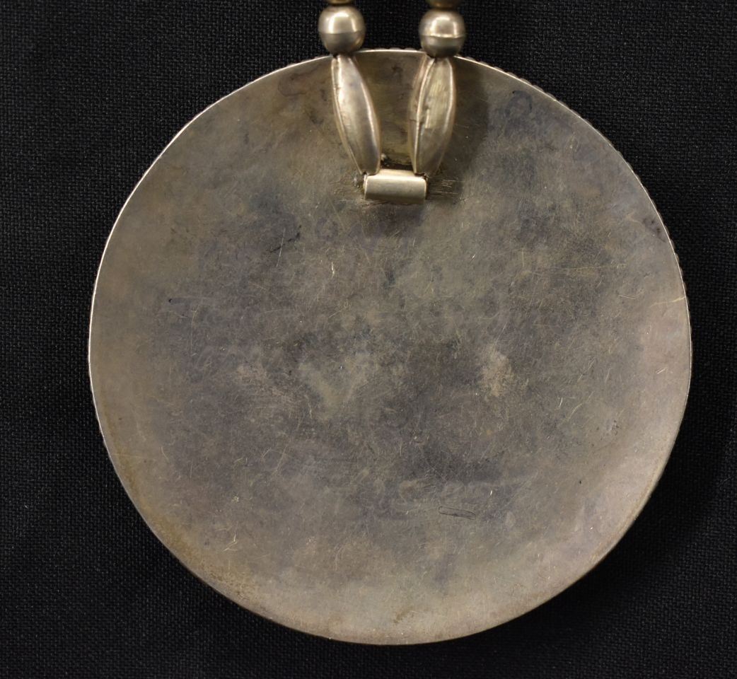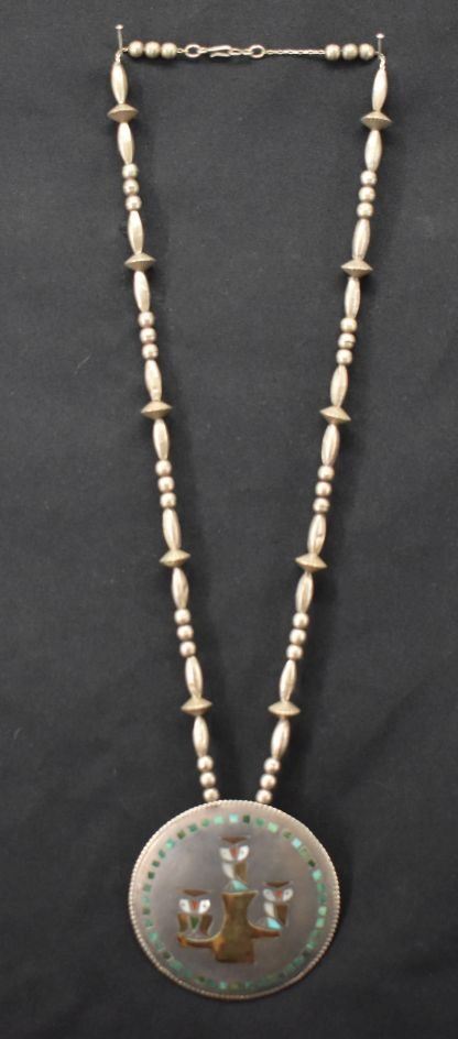1970's Zuni Indian, sterling silver bead necklace 26'' long . Turquoise and shell set in sterling silver depicting owls pendant 3'' dia. Total weight 82 grams