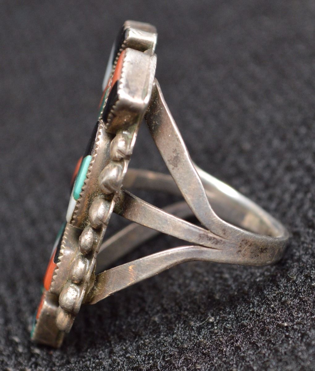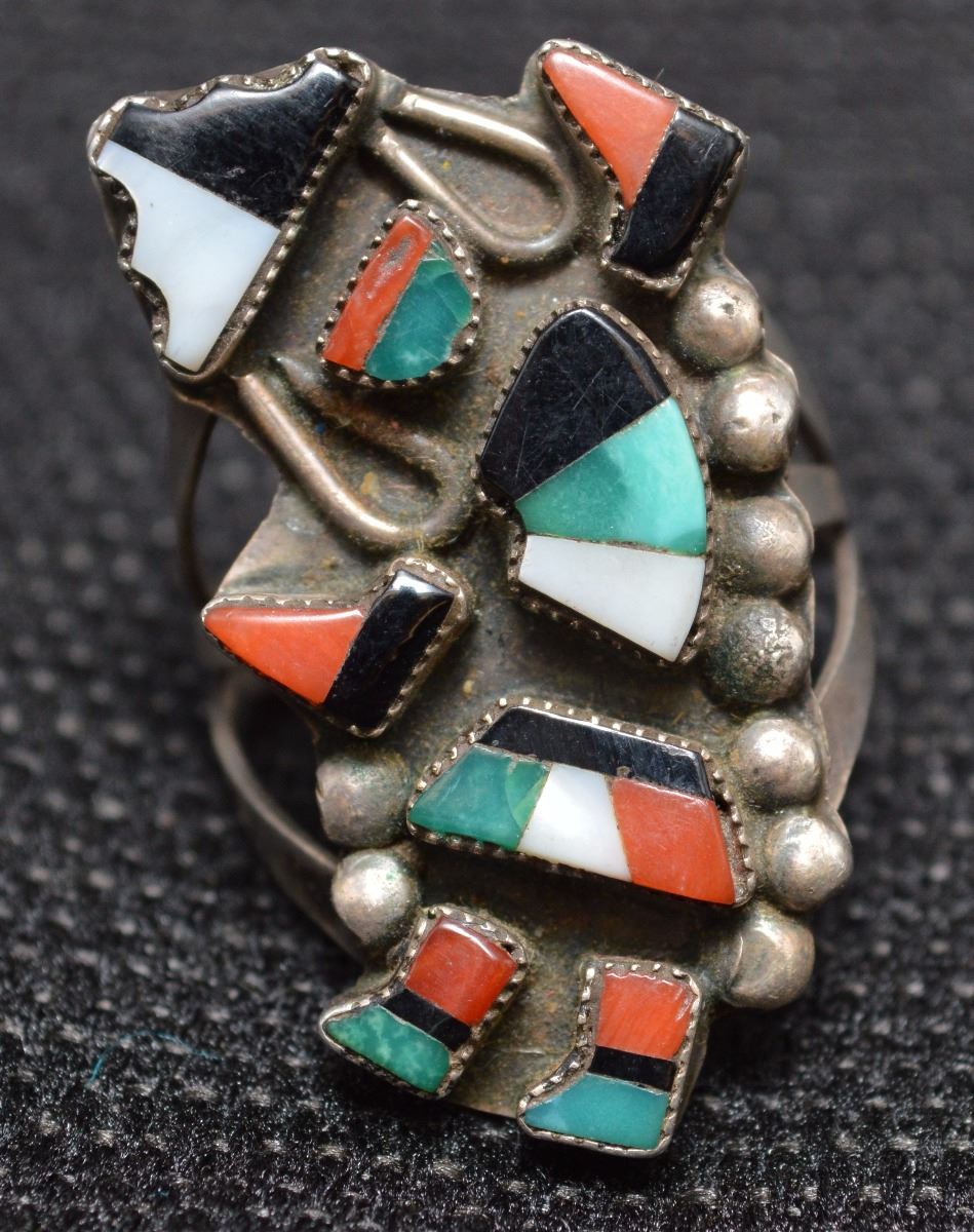 1960-70's. Sterling silver with mosaic inlaid coral, shell and malachite bent kachina figure. Size 6, .2 oz.