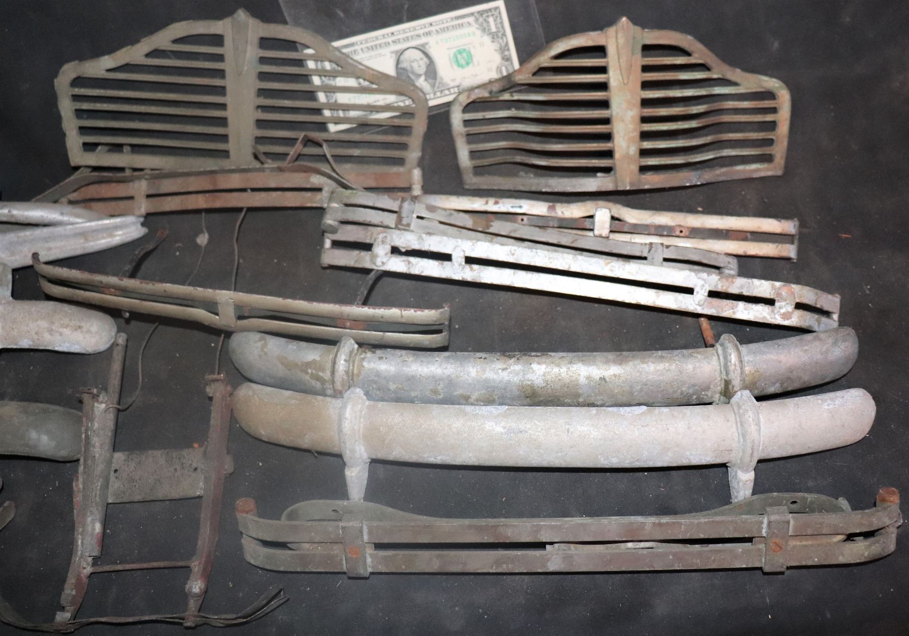 This one lot contains "about 20" car bumpers and grilles. All are metal. Some are cast and some are multi-layered, created from stamped steel. All are are 1930-1945.