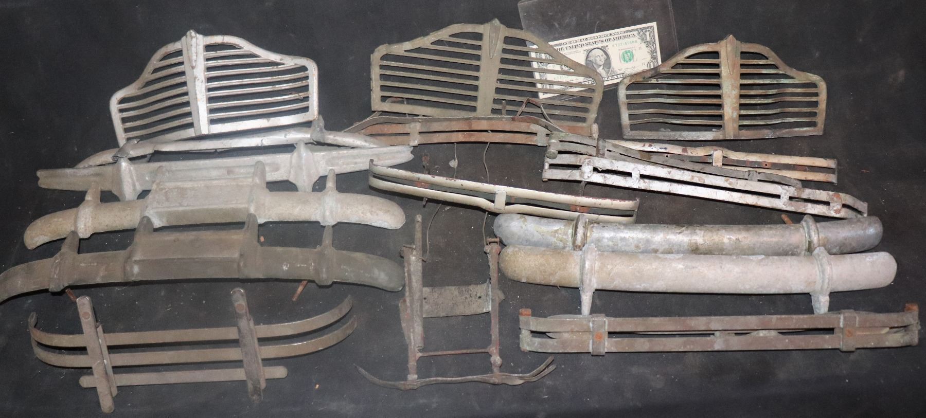 This one lot contains "about 20" car bumpers and grilles. All are metal. Some are cast and some are multi-layered, created from stamped steel. All are are 1930-1945.