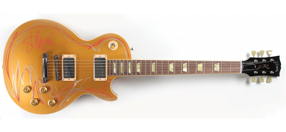 Gold-bodied Gibson USA Les Paul electric guitar, signed on the body in pink ink by Gibbons, adding a pinstriped design to the edges in pink and silver ink. In fine condition. Accompanied by a full letter of authenticity from Roger Epperson/REAL, the original Gibson hardshell case, and a photo taken at the time of signing.
