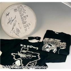 <B>ZZ Top - Concert Memorabilia Group (undated).</B></I> Several nice souvenirs from a ZZ Top concert make up this interesting group of items, which include a drumhead signed by all three members with a complete setlist written along one side; a pair of "cheap sunglasses" with the ZZ Top "Eliminator" logo on each earpiece; and two unused black t-shirts (size M) featuring different Top logos printed in white. Sharp! <I>Accompanied by COA from PSA/DNA. </B></I> <BR><BR><B>Important notice:</B> Heritage usually auctions material at the rate of 200-250 lots per hour. On some occasions eBay Live bid software or the Internet may not be able to keep up with the pace of the auction. We recommend placing a realistic absentee bid now as insurance to avoid disappointment. Occasionally the auctioneer may eliminate or reject an eBay Live bid, and the auctioneer may also reopen a lot after the close of the eBay live bidding (usually because we missed an audience bid), and may reject your bid even if it shows you as the winning bidder. By bidding via eBay Live, you agree that Heritage may award the lot to another bidder at its sole discretion under the circumstances described above or any other reasonable circumstances. Since eBay bids are not shown to us until we open the lot on the floor, we treat those bids just like floor bids. In most cases the floor responds before the eBay bid is presented to us, due to Internet lag time, so for consistency we have made it a policy that floor bids are always considered first over tie eBay live bids. Also please note that all Heritage lots purchased through eBay Live carry a 24.5% Buyer's Premium. Please make sure you read the Terms and Conditions before you bid.
