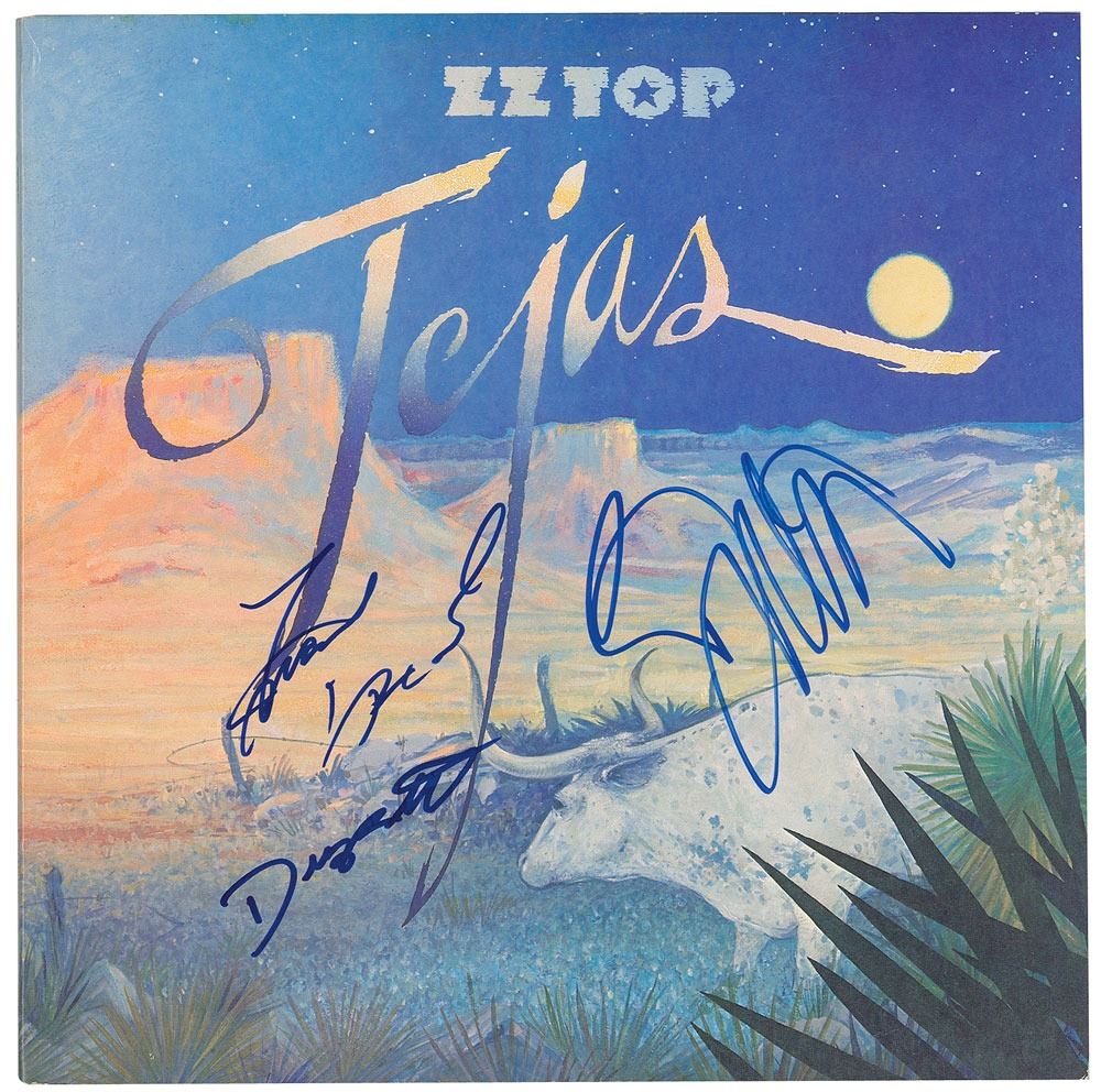 Tejas album by ZZ Top, signed on the front cover in blue felt tip by Billy Gibbons, Dusty Hill, and Frank Beard. In fine condition, with a small area of removed price sticker residue. The record is included. Accompanied by a John Brennan Collection letter of provenance.