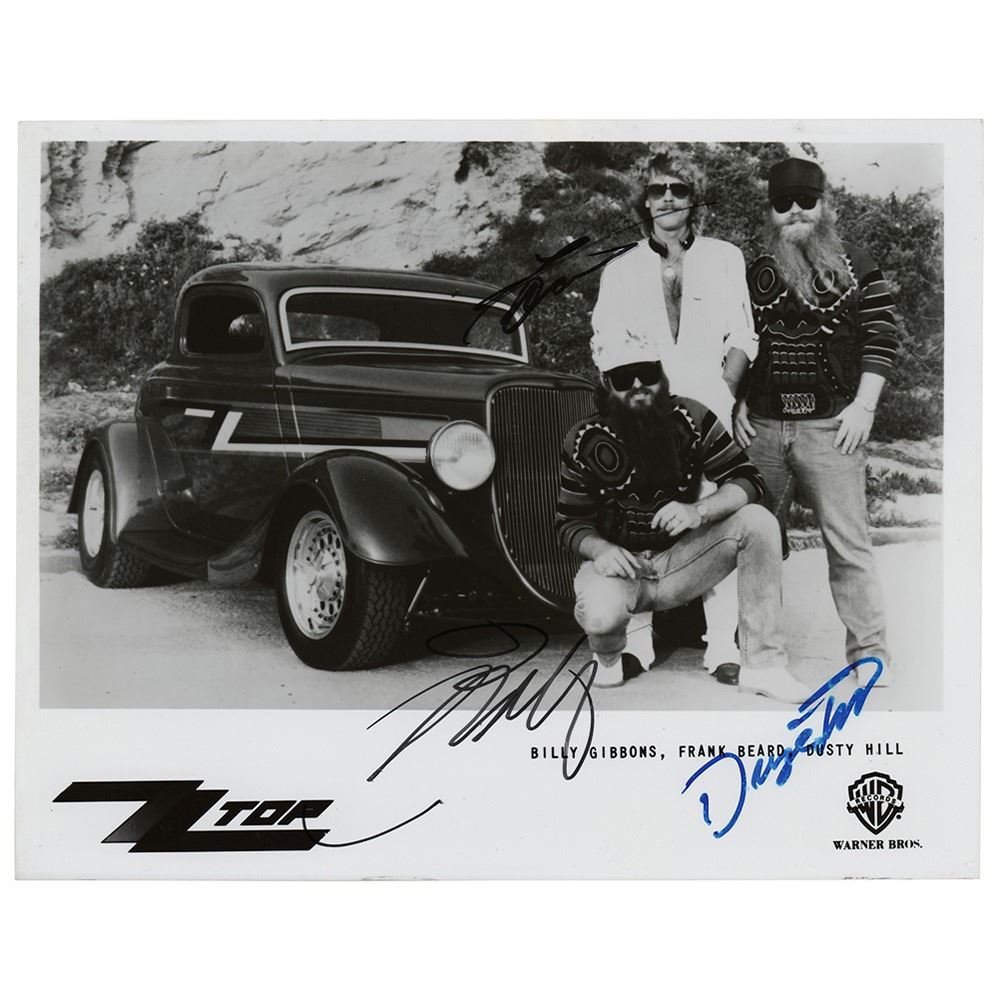 Glossy 10 x 8 Warner Bros. publicity photo of ZZ Top posing with their 1933 Ford coupe 'Eliminator,' signed in blue and black felt tip by Billy Gibbons, Dusty Hill, and Frank Beard. In fine condition.