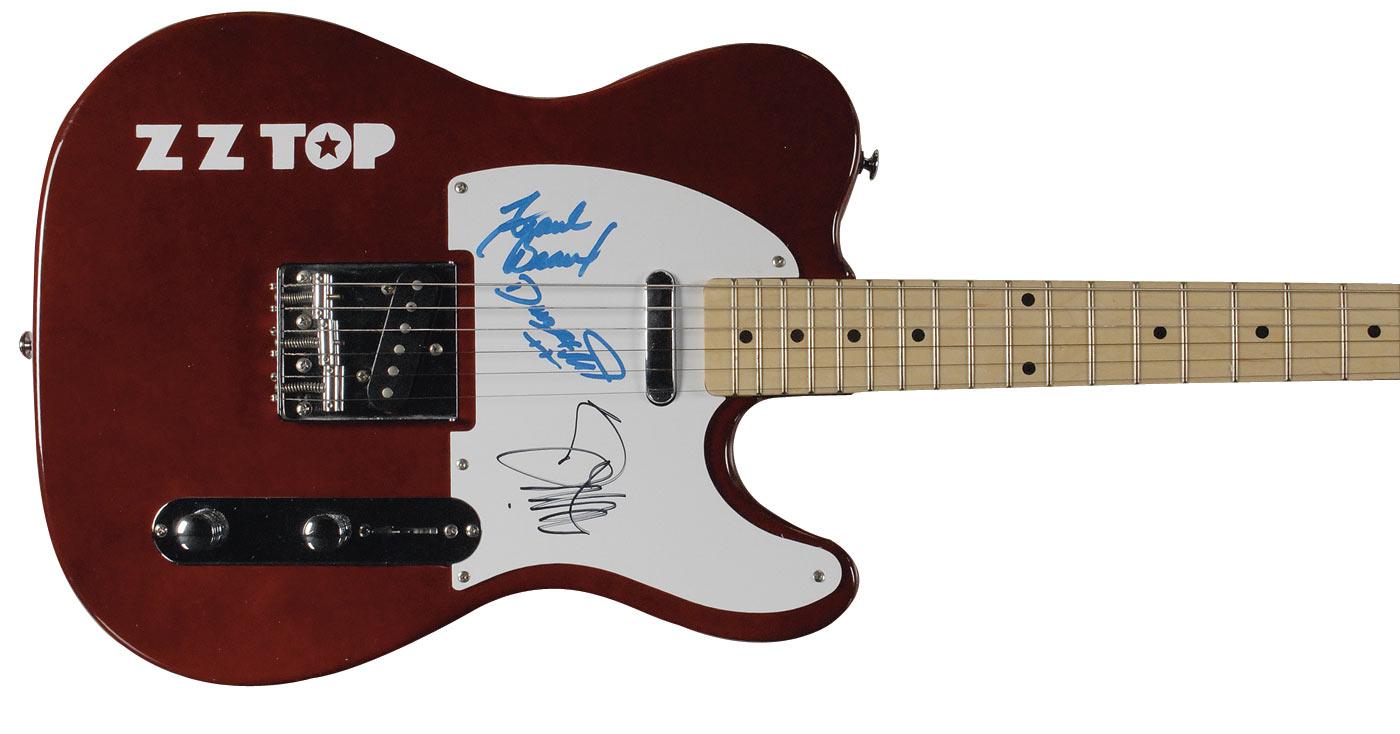Red-bodied Copley ‘telecaster-style’ electric guitar, with the band’s name on the body, signed on the white pickguard in blue ink by Dusty Hill and Frank Beard and in black felt tip by Billy Gibbons. In fine condition. Oversized.
