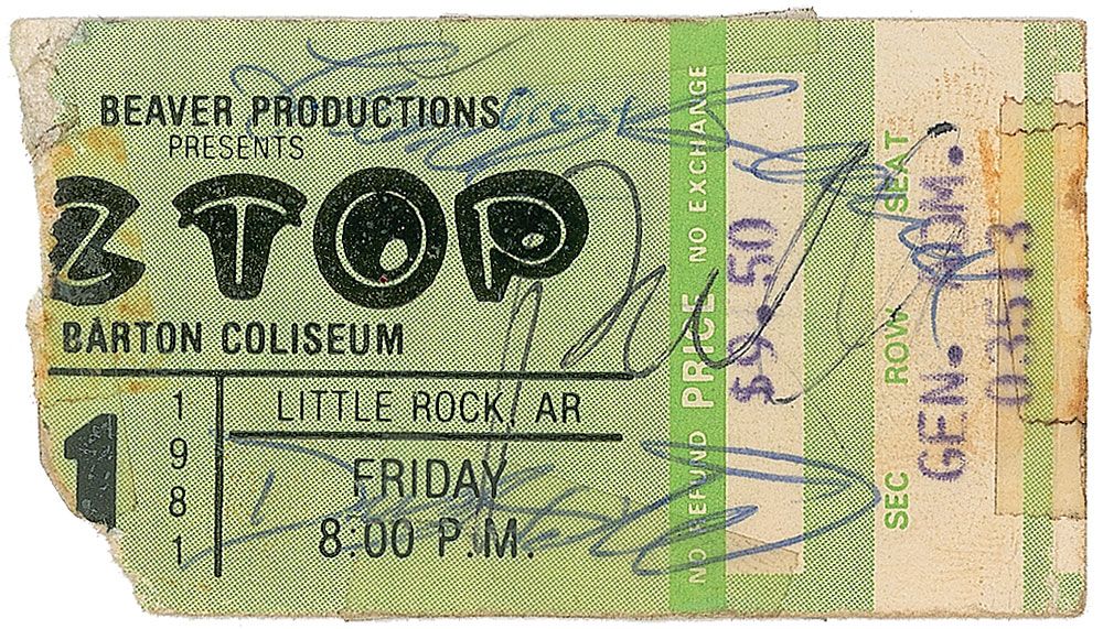 Original ticket stub from the band’s performance at the Barton Coliseum in Little Rock, Arkansas, on August 21, 1981, 2.5 x 1.5, signed on the front in blue and black ballpoint by Frank Beard, Billy Gibbons, and Dusty Hill. In very good condition, with rough left edge, old tape over portions of two of the signatures, and some scattered light toning.