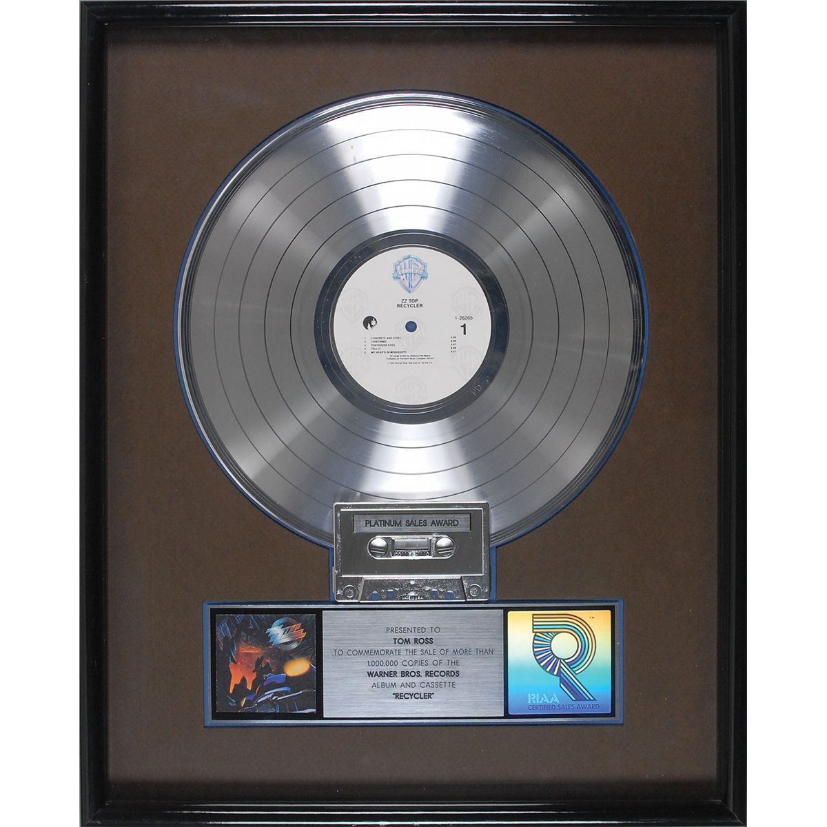 ‘R’ hologram-style RIAA platinum sales award presented “to Tom Ross to commemorate the sale of more than 1,000,000 copies of the Warner Bros. Records album and cassette ‘Recycler.’” Framed with the platinum disc, cassette, and plaque with an image of the album cover to an overall size of 17 x 21. In fine condition.