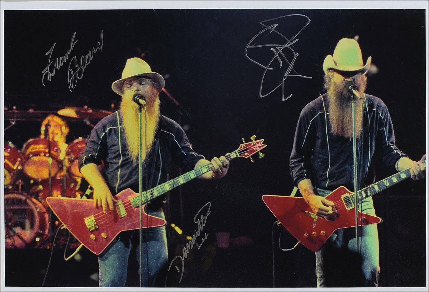 Color 19 x 13 laser print photo of the band performing, signed in silver ink by Dusty Hill, Frank Beard, and Billy Gibbons. In fine condition.