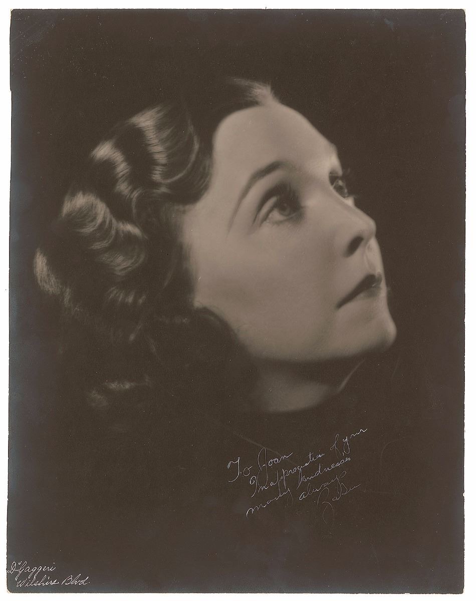 Superb vintage matte-finish 10.5 x 13.5 D’Gaggaeri portrait of Pitts with a haunting upward gaze, signed and inscribed in white ink, “To Joan, In appreciation of your many kindnesses, always, Zasu.” Signed in the lower left in white ink by the photography studio. Trimmed and in fine condition, with some chipping to edges and light scattered silvering.