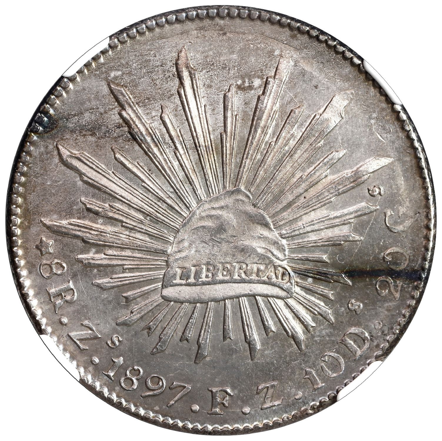 Zacatecas, Mexico, cap-and-rays 8 reales, 1897 FZ, NGC MS 64.