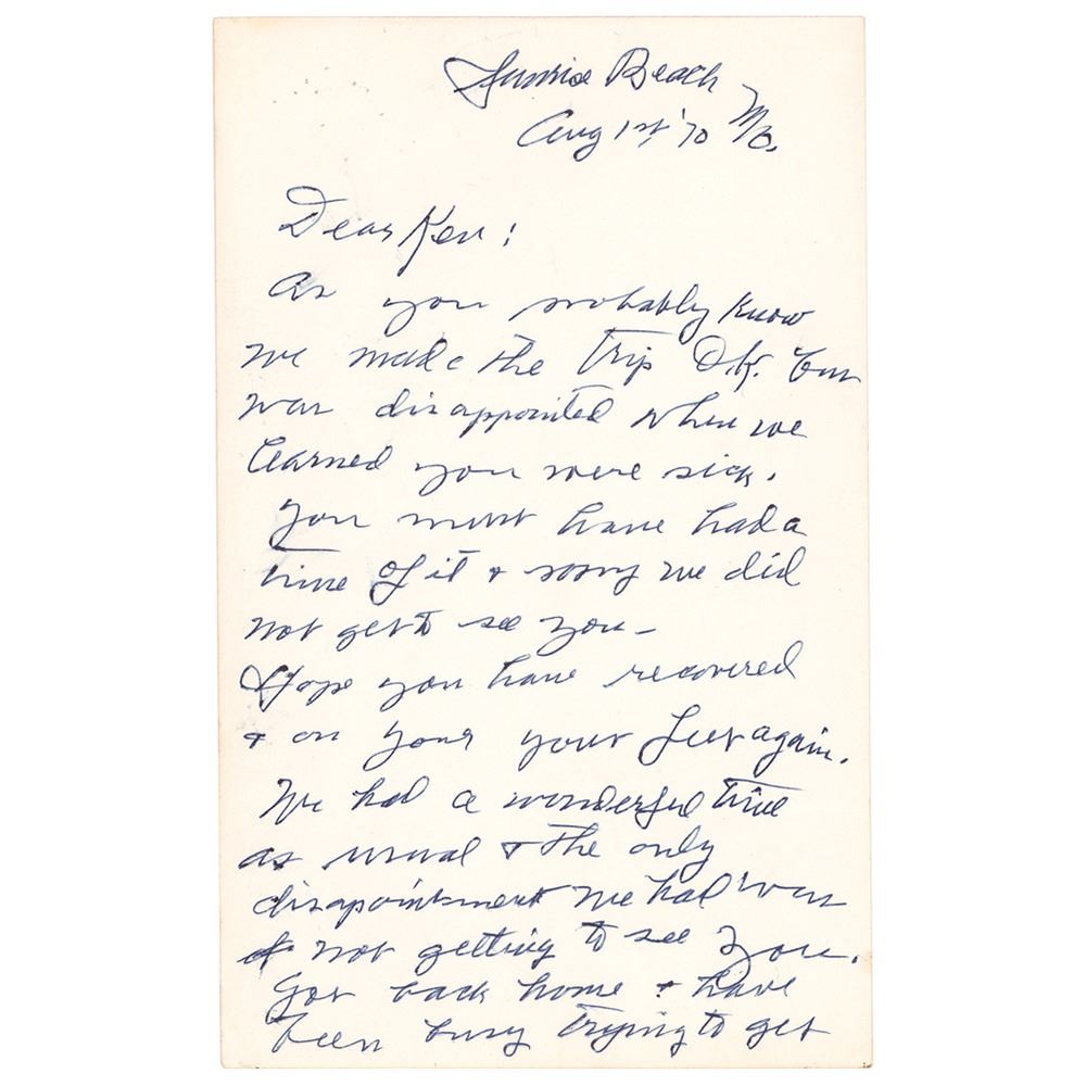 ALS signed "Zack," two pages, 5 x 8, August 1, 1970. Letter to Ken Smith, director of the National Baseball Hall of Fame and Museum. In part: "As you probably know we made the trip O.K. but was disappointed when we learned you were sick…We had a wonderful time as usual & the only disappointment we had was not getting to see you. Enclosed is the expense acct. hope it is not disappointing, but seems like everything is higher than usual." Wheat's handwritten invoice is included, totaling $636, as well as the itinerary for his flights, signed along the bottom, "Ken: I paid for this plane fare which was 486.00, Zack." In overall fine condition. Accompanied by a TLS from Smith forwarding the expense account to Charles S. Feeney, president of the National League. Wheat was inducted into the Hall of Fame in 1959.