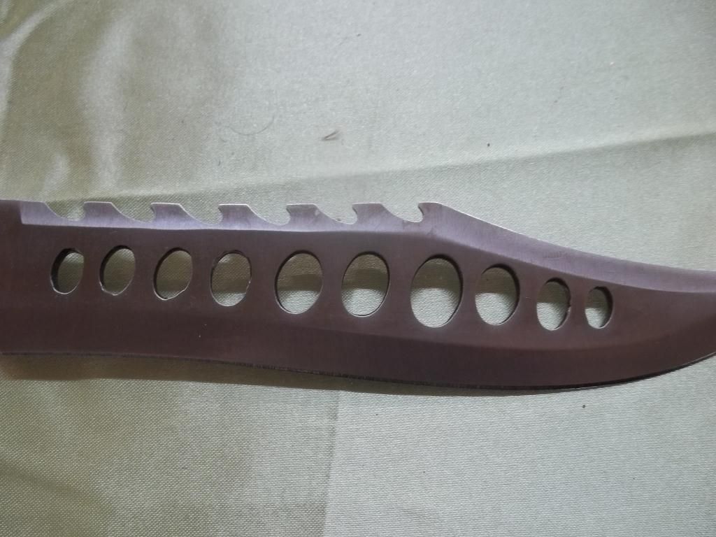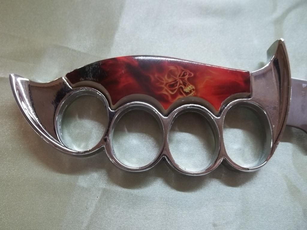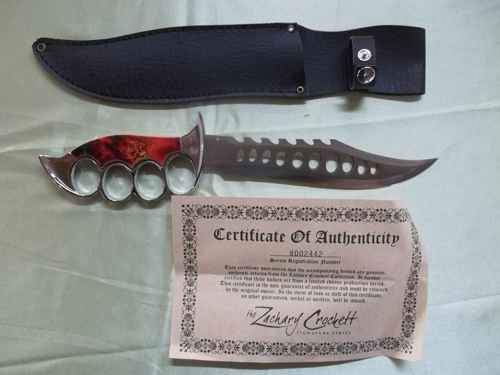 W/Stainless Steel Vented Blade W/Sawback Spine, Brass Knuckle Design Handle W/Plastic Overlay Flaming Skull & Leather Sheath. 14" & COA