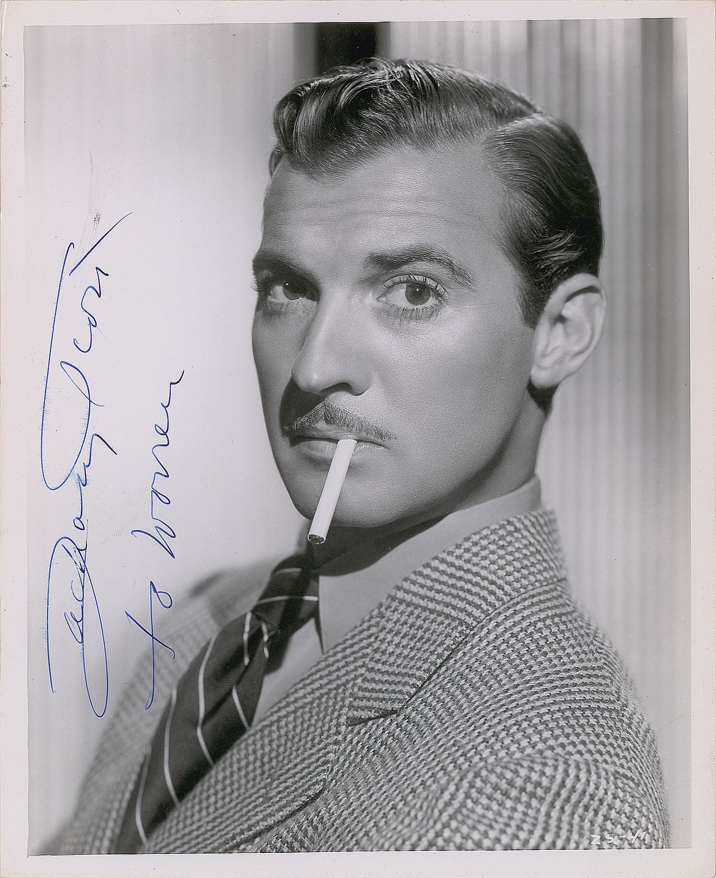 American actor (1914–1965) who is most notable for playing villains and 'mystery men'; he is best remembered for his roles in The Mask of Dimitrios, The Southerner, and Mildred Pierce. Vintage glossy 8.25 x 10 studio portrait of Scott with a cigarette dangling from his mouth, signed and inscribed in blue ink, "Zachary Scott, to Warren.” In fine condition.